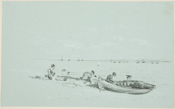 Editor: Here we have Figures on the Beach, done in the style of Turner. It’s a watercolor drawing and it makes me think about leisure and the public's access to coastal spaces. What do you notice about the way this scene might reflect societal norms? Curator: Well, the loose brushstrokes and muted colors create a sense of transient beauty, but also anonymity. Notice how the figures are generalized, almost like silhouettes. Who has the privilege to be at leisure like this, and who is excluded? It makes me consider the socio-economic factors at play. Editor: So, the painting becomes a record of who had access to public spaces at a specific time? Curator: Exactly! And how the very act of portraying it reinforces or challenges those power structures. It encourages us to reflect on who gets to be visible and represented. Editor: That gives me a lot to think about in terms of representation and access. Curator: Indeed, it's a reminder that even seemingly simple landscapes can be loaded with cultural and historical meaning.