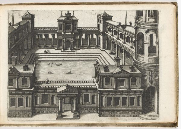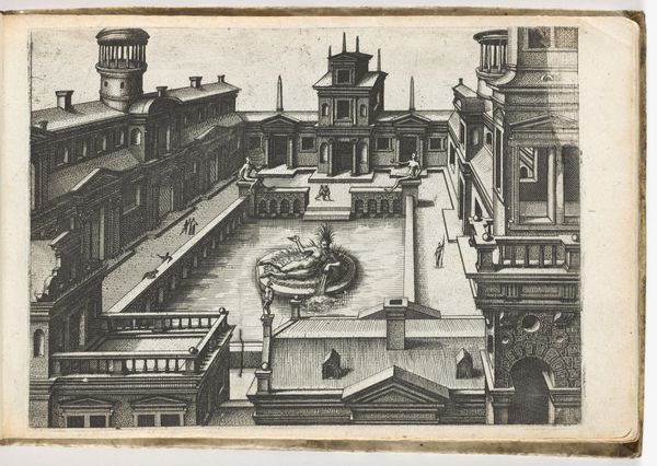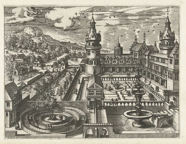 Curator: This print, "View of a Palace with Inner Courtyard on the Left and Facing Garden with Fountain," is attributed to Joannes van Doetecum. It captures a rather elaborate architectural scene, doesn't it? Editor: It does! My initial impression is one of rigid formality, an almost stage-like setting, yet it feels strangely unreal, more a dreamscape than an actual place. Curator: Notice how the artist uses perspective to emphasize the palace's grandeur, placing the viewer at a distance, underscoring the power dynamic inherent in such spaces. Editor: Absolutely. The symbols of control are clear: the towering structures, the manicured gardens, the geometric precision. It speaks of a desire to impose order, reflecting societal hierarchies. The figures are so small. Curator: The fountain, the symmetry, the carefully placed figures—it's all part of a visual language of authority and cultivated taste. Editor: Perhaps a reflection of the era’s values—the emphasis on reason, order, and control, but to my eye, it feels cold, detached from lived experience. But then, maybe that's the point. Curator: Indeed. This image serves as a window into understanding the values and aspirations projected onto architectural spaces during this time. Editor: And as a reminder of how those spaces shaped and continue to shape our understanding of power and privilege.