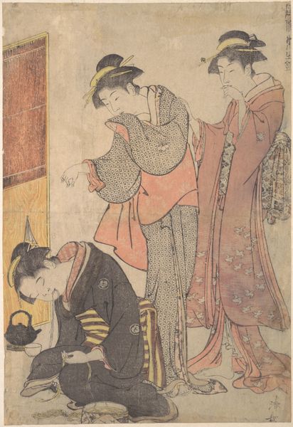 This medium-size print was created by Suzuki Harunobu in 18th century Japan, and it’s rich with visual symbols. The most striking motif here is the tonsured boy arranging a woman's hair. The shaved head immediately marks him, not as a child, but as a young acolyte in a Buddhist monastery. The act of arranging hair, seen across cultures and throughout history, is here transformed. No longer a simple grooming act, it becomes imbued with religious undertones, the acolyte’s touch carrying the weight of spiritual discipline. We are drawn to this curious juxtaposition. Consider the tonsure itself. It symbolizes renunciation, a detachment from worldly vanity. Yet, here it is, intimately involved in an act of beautification. This tension engages viewers on a deep level, reflecting the complex interplay between worldly desires and spiritual aspirations. This cyclical interplay of tradition is resurfaced and reimagined, reflecting enduring facets of the human experience.