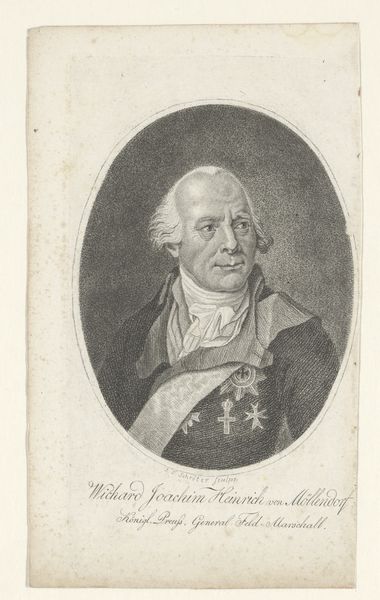 Editor: This is an etching and engraving of A.P. Bernstorff by J.F. Clemens, dating back to sometime between 1748 and 1831. It’s a fairly standard portrait of a nobleman, but what strikes me is how serious he looks. What's your take on it? Curator: Well, portraits, especially those rendered with the precise techniques of etching and engraving, were tools used to solidify power and construct identity in the 18th century. Consider how Bernstorff is posed, clothed, and framed. How might this image have contributed to the construction and maintenance of his public image? Editor: So, beyond just a likeness, it's presenting a specific idea of who he was meant to be? Curator: Exactly. Think about the historical context. Bernstorff lived through a period of intense social and political upheaval. How did figures like him navigate the shifting landscape of power, privilege, and emerging ideas about human rights and liberty? The seriousness you mentioned, does it reflect a weighty burden of leadership or perhaps an anxiety about holding onto power? Editor: I see what you mean. It's not just a picture; it's a statement. I wonder if the artist intended that feeling of anxiety to be so prominent, or is that something that comes with a contemporary reading? Curator: That is the key. An artwork engages in constant dialogue across time, right? Our understanding of historical context is invariably shaped by contemporary values. How do we, as viewers from a later era, reckon with representations of figures who benefitted from systems we now critically examine? How does art such as this challenge us to reconcile history with our present understanding of justice and equality? Editor: This has given me a lot to think about, especially regarding the relationship between art, power, and our own perspectives. It's definitely more complex than I initially thought! Curator: Precisely. Art invites us to critically examine the narratives we've inherited and the power structures that have shaped our world. This engraving, seemingly simple, provides such insight.