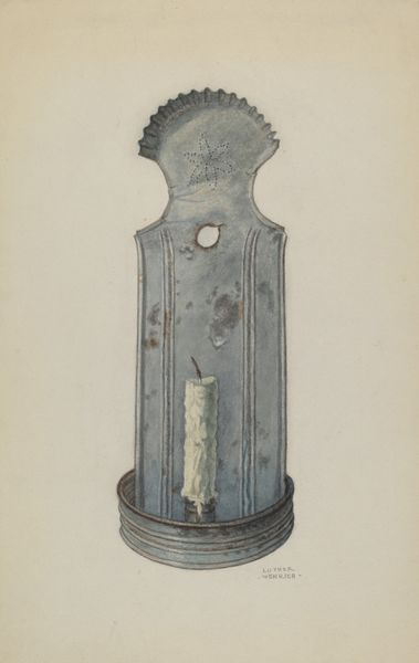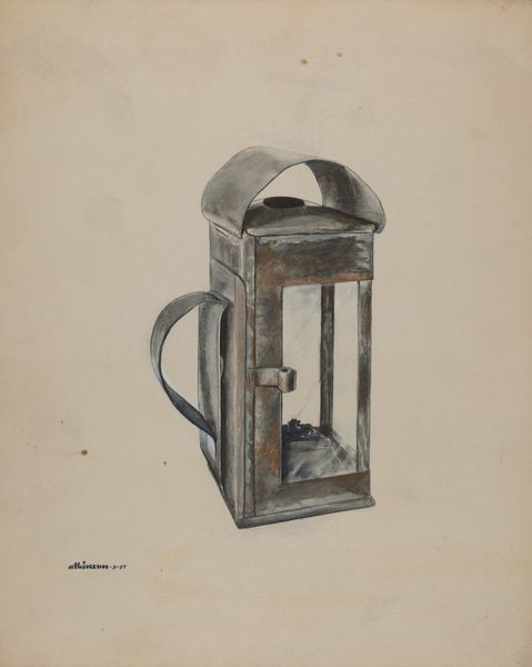 Albert Geuppert made this watercolor and graphite drawing of a candle lantern sometime in the 20th century. It depicts a utilitarian object designed to protect a candle from wind and rain. The humble lantern speaks to a time before widespread electrification when individual light sources were vital, especially for those traveling at night. As historians, we consider how such objects were part of a broader social infrastructure, providing safety and security in communities. The lantern’s design, with its simple form and practical handle, reflects a focus on function over elaborate ornamentation. Studying objects like this lantern, along with period inventories, trade records, and social histories, helps us understand the daily lives and material culture of past societies. Art gives meaning to the social context, and understanding it relies on such historical and institutional research.