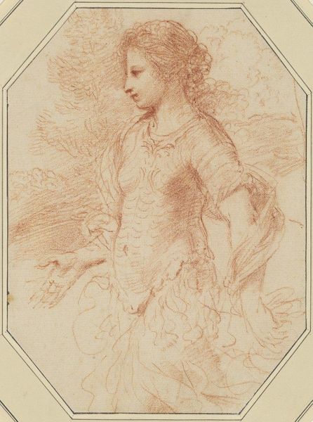 Charles-Joseph Natoire rendered this study of a "Head of a bacchante" in the 18th century with chalk, heightened with white, on paper. The chalk medium, which is made by grinding dry pigment and binding it with a gum or resin, allows for a delicate softness, especially well-suited to the subject matter: a woman associated with the Roman god of wine, Bacchus. Natoire has deployed a range of hues - red, black, white - to create the form. Notice the subtle gradations of tone, which give the face its three-dimensionality. Drawings like this one are associated with traditional studio practice, a mode of production involving both labor and skill. The artist may have made this study in preparation for a larger painting, or it may have been considered a work of art in its own right. When we consider the material qualities of an artwork, along with its making, we can better appreciate the artist's skill and intention, allowing us to move beyond simple distinctions between art and craft.