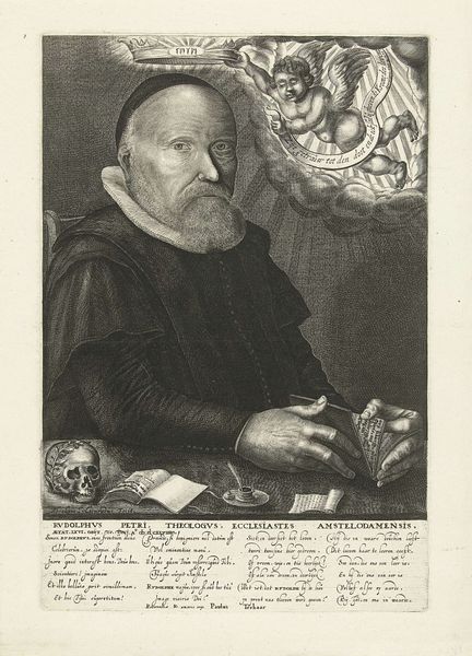 This is Jonas Suyderhoef’s portrait of Adriaen Tegularius, an engraving that captures the sitter’s likeness with remarkable detail. The composition is dominated by Tegularius’s figure, rendered in a play of light and shadow, creating a study of texture and form. The engraving elicits a contemplative mood, inviting reflection on the sitter’s character. Suyderhoef masterfully uses the linear quality of engraving to define shape and volume. Note the dense network of lines that model Tegularius’s face and clothing, a technique that lends the image a palpable sense of depth. The textures—the crispness of the collar, the soft fabric of the cloak—are conveyed through variations in line density and direction, underscoring the materiality of the subject. The inscriptions framing the portrait engage in a semiotic dance, offering textual clues that both complement and complicate our reading of the image. This interplay between image and text highlights the constructed nature of representation and the multiplicity of meanings inherent in portraiture. Ultimately, the artwork prompts us to consider how identity is fashioned through visual and textual signs within a specific cultural context.