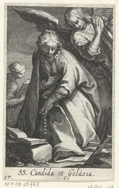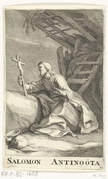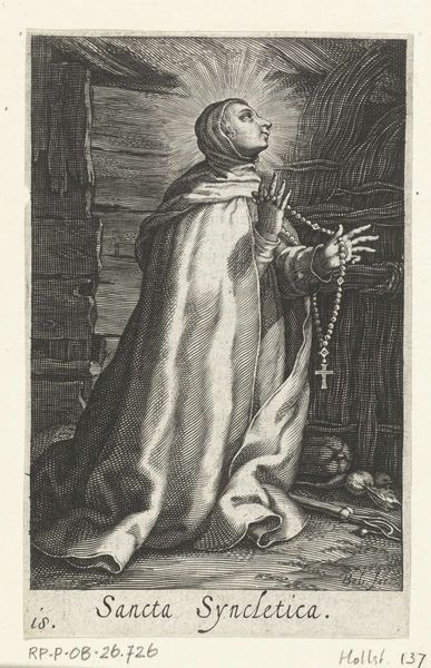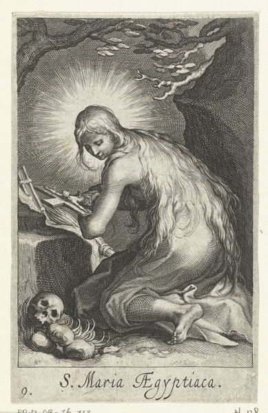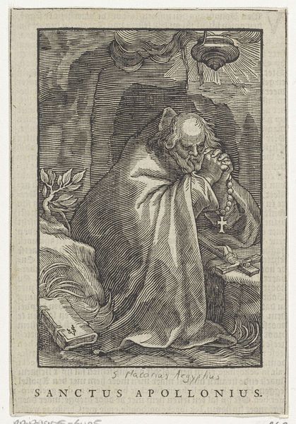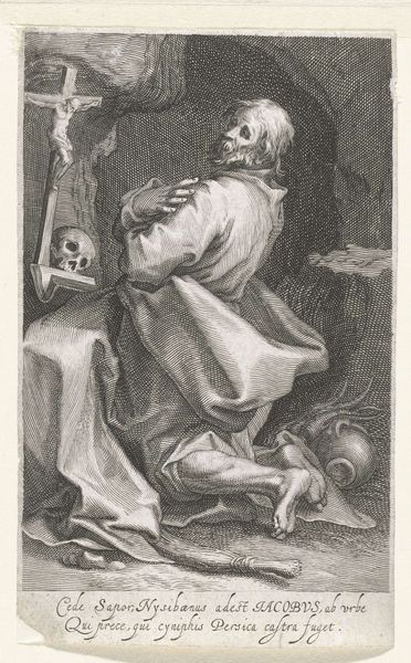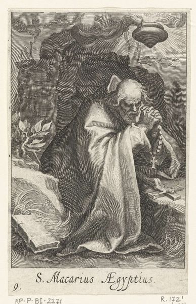 Editor: We're looking at "Saint Elias of Caesarea as a Hermit" by Boëtius Adamsz. Bolswert, made between 1590 and 1619. It’s an engraving. I’m struck by the texture created by all the fine lines and how that contributes to a feeling of isolation and devotion. What catches your eye about the print, as an art expert? Curator: The manipulation of line is indeed paramount. Note how the density and direction of the engraved lines delineate form and space. The figure's drapery, for instance, is rendered with remarkable attention to how light falls and articulates volume. Do you perceive how the engraver uses contrasting patterns of lines to differentiate between the saint's rough clothing and the smooth rocks of his hermitage? Editor: Yes, the clothing seems almost to blend in with the cave, further emphasizing the ascetic environment. What does the overall composition say to you? Curator: Observe the strategic placement of the figure within the pictorial space. The diagonal thrust of Saint Elias's posture directs the eye toward the upper reaches of the composition, yet his hunched form simultaneously suggests humility and confinement. Also consider the distribution of light and dark—how the engraver manipulates contrast to create a dramatic, almost theatrical effect. Is it your assessment that the formal qualities are there to deliver content? Editor: It does seem as though Bolswert masterfully uses these linear strategies, texture, and composition to communicate a devotional mood within the engraving. I can't help but find the line work pleasing to observe. Curator: Exactly. The artist invites contemplation not only through the subject matter, but also through the very act of looking—analyzing how line, form, and contrast combine to create a compelling visual experience. It reminds us that form itself can be a potent source of meaning.
