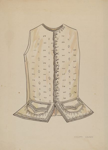 Melita Hofmann's 'Cape' presents a delicate garment rendered with careful consideration of pattern and form. The all-over pattern of small, dark motifs against a pale background suggests a meticulous, almost meditative process. This approach to artmaking as a sustained, thoughtful engagement with the medium is something I deeply connect with. Looking closely, the texture is smooth, the paint thin and translucent, allowing the underlying paper to subtly influence the color. The consistent size and spacing of the clover-like motifs create a rhythmic visual effect. There is something soothing in that repetition, in that dedication to craft. This piece reminds me of Agnes Martin, her quiet, grid-based paintings that seem to hover. It's this embrace of subtlety and intricacy, this valuing of quiet labor, that makes Hofmann's work so compelling. The 'Cape' invites us to slow down, to appreciate the nuances of pattern and process, and to find beauty in the everyday.