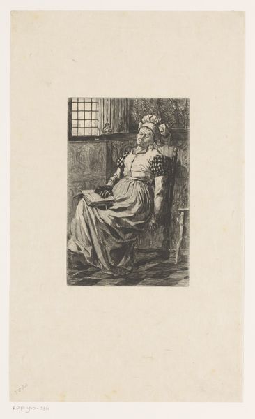 Editor: Here we have "Slapende vrouw op een stoel met boek op schoot," or "Sleeping Woman on a Chair with Book in Her Lap," a drawing by Willem Geets, made sometime between 1848 and 1910. The first thing that strikes me is how wonderfully informal it feels. Almost like we’re peeking into someone's private, very quiet moment. What do you see in it? Curator: Ah, yes, the intimacy! I'm drawn to that too. The beauty here lies not just in the realistic depiction of sleep, but in the invitation to ponder what came before and what might happen after. I imagine she had just finished a particularly engrossing chapter. I wonder what she was reading. Perhaps something thrilling? Or maybe something profoundly dull. The weight of the book… Do you see how the artist used shading to create depth in the folds of her dress and the shadows around her face? Editor: Definitely. It's amazing how he captured the weight and texture with such delicate lines. There's something almost melancholic about it, wouldn't you agree? Curator: I suppose it could be viewed as melancholic. Or maybe, it's more about peaceful exhaustion. Think about the checkered floor, quite boldly patterned, next to the quiet of her figure. It’s a study in contrasts. What does that contrast say to you? Does the pattern wake you up while the woman falls asleep? Editor: That's such an interesting point! I was so focused on her expression, I hadn't considered that. So, maybe it's not just a quiet moment, but a moment of dynamic tension. The pattern suggesting the possibilities around her... Curator: Exactly! It hints at a world outside her slumber. That's why it resonates, perhaps? Because it reflects our own internal tug-of-war between action and repose? What a beautiful push and pull. Editor: This has really changed my view of the piece! Now I'm seeing that sense of quiet possibility in contrast with the checkered background. Curator: And I’m struck by the universality of this depiction. Haven't we all been there, nodding off mid-page? It reminds me of the beauty we can find in simple human experience and observation, even unintentional.