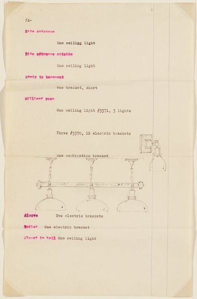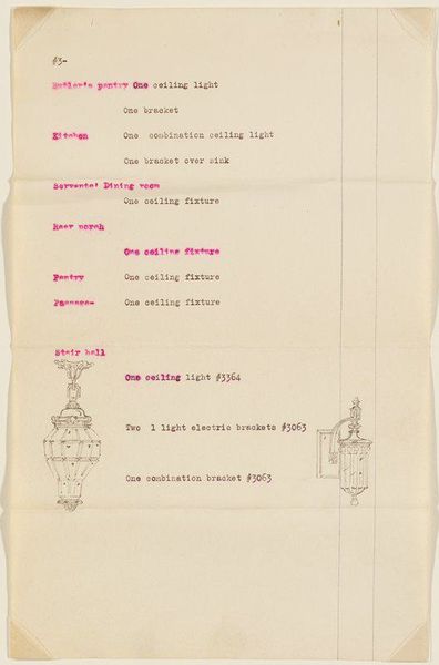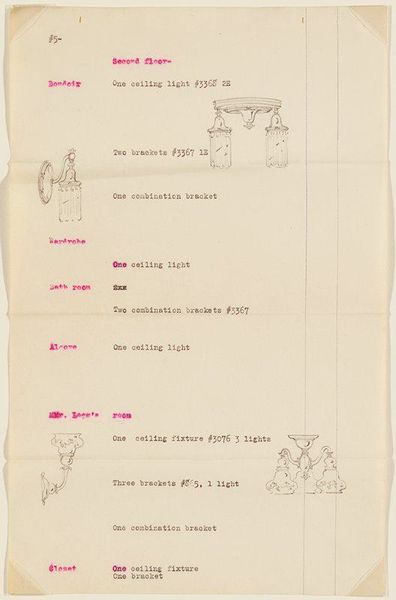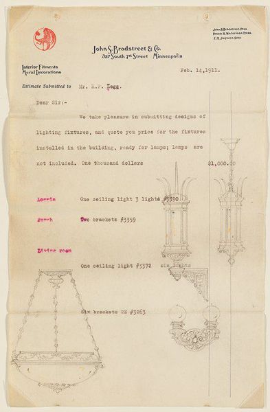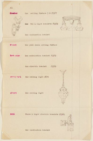 This is a Page of Proposal for Lighting Fixtures made around the turn of the century by John S. Bradstreet and Company. The marks and notations on this proposal look like they were made with a typewriter, the designs, however, are lovingly hand-drawn. There’s something very satisfying about the materiality of this piece, the way the paper has been folded and worn. The artist has included lots of information, which seems very pragmatic, but the handwriting, the quick but elegant sketches of possible light fittings, are playful. Look at the bracket on the right hand side. The attention to detail is lovely. The physicality of the pen on paper in that particular flourish makes me think of Hokusai and his sketches. It's these small moments of care and attention that give the piece its warmth and depth. Ultimately, it’s the fact that this is an ephemeral, working document that elevates it from a design document into a work of art. It celebrates the everyday, and captures a moment in time.