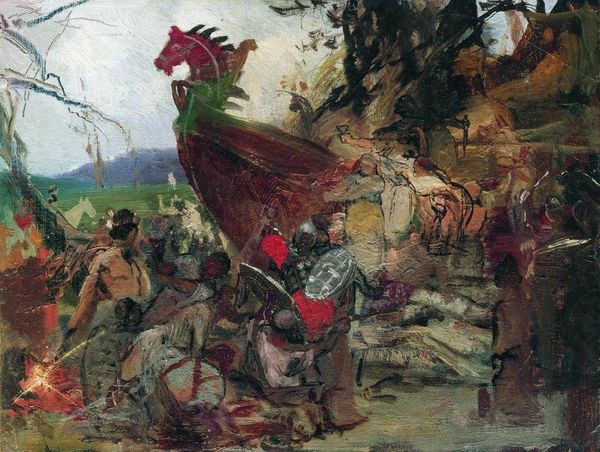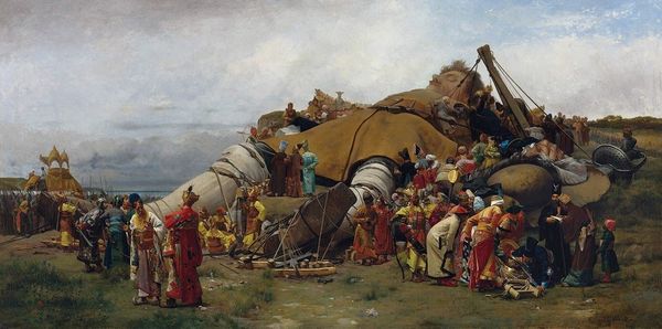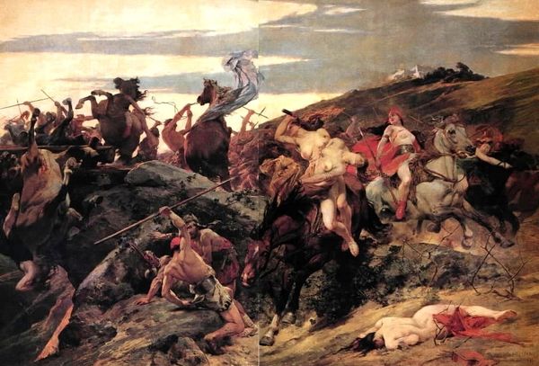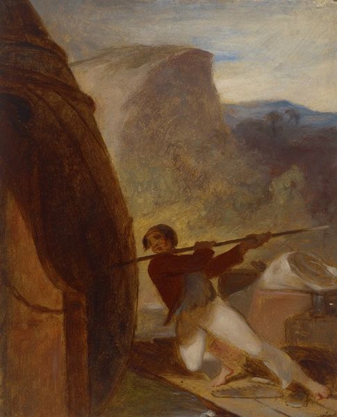 Alfred Dehodencq’s oil on canvas painting presents a scene dominated by ochre and blue hues, depicting Arab horsemen on a bridge. The figures are arranged along the diagonal axis of the bridge, creating a dynamic upward movement against the serene backdrop of a pale sky and distant mountains. Dehodencq skillfully uses color to differentiate the riders from their environment, employing warmer tones for the figures that contrast with the cooler blues and greens of the landscape. The composition invites a semiotic reading where the bridge acts as a threshold, mediating between different worlds or states. The raised rifles introduce an element of tension, suggesting themes of readiness and potential conflict. The contrast between the detailed figures and the broad, gestural landscape suggests a negotiation between specificity and generality. This interplay reflects the artist's engagement with both the particulars of the scene and broader cultural narratives.