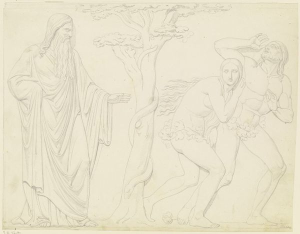 Curator: Frances Richards' "The Stoning of Stephen," currently residing in the Tate Collections, presents a stark vision in monochrome. Editor: It's incredibly direct. The starkness heightens the drama, almost like a stage play frozen mid-action. The linear quality is striking. Curator: Absolutely. Richards strips away any excess, focusing on the brutal act itself. The stoning of Stephen is a potent symbol of religious persecution. It speaks to the dangers of ideological rigidity. Editor: The composition, too. The figures are almost geometric in their rendering. Note the angularity, the tension it creates, like a visual representation of the violence itself. The very lack of color amplifies the emotional impact. Curator: Indeed. The buildings in the background remind me of medieval fortresses, which speaks to the sense of power and authority that is being abused here, and the tree branches look skeletal, almost reaching out as if in mourning. Editor: Yes, the linear rendering contributes to this sense of graphic directness. In a way, the simplicity becomes extremely impactful. Curator: It remains a powerful meditation on faith, violence, and the abuse of power. Editor: A powerful composition indeed, especially considering the graphic restraint. It stays with you.