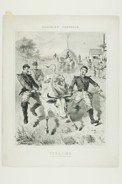 Editor: We’re looking at Winslow Homer’s "Campaign Sketches: Coffee Call," from 1863. It's a print – probably a lithograph or engraving – on paper. The scene shows a line of soldiers waiting for coffee. What strikes me is how ordinary it feels, considering it depicts the Civil War. What stands out to you? Curator: You're right, that's precisely what Homer captured so brilliantly: the everyday existence within the extraordinary circumstances of war. It's fascinating to consider the role images like this played in shaping public perception. How do you think images like this, widely disseminated at the time, affected civilian understanding of the war? Editor: I imagine they made it more relatable. The newspapers back home likely circulated these images, no? Seeing the soldiers doing something as simple as getting coffee… it’s far from the heroic battle scenes. It humanizes the conflict. Curator: Exactly! These prints became crucial documents of the war, disseminated broadly. Publications like *Harper's Weekly* capitalized on public interest, and Homer, as an embedded artist, carefully crafted his imagery. Did you notice how Homer positions the African American cook? Editor: Yes, he's separate from the line of white soldiers. I suppose that was society at the time? Curator: Precisely. Consider the politics of representation. While seemingly benign, Homer's compositions reinforced existing social hierarchies. Art wasn't just reflecting reality; it was actively participating in the construction of national identity. What do we make of that today? Editor: It’s complicated. It’s valuable to see these historical depictions, but also essential to understand their role in perpetuating inequalities. It’s a far cry from a neutral depiction, I realize now. Curator: Indeed. And remembering this pushes us to look critically at the imagery circulating today. Every image carries a perspective, and understanding that is the first step toward interpreting any work of art.