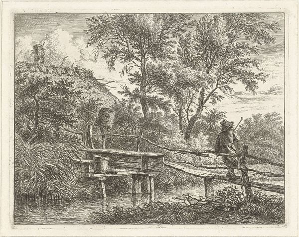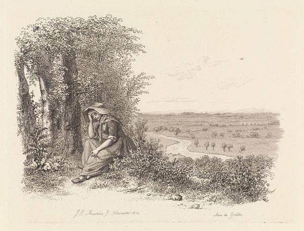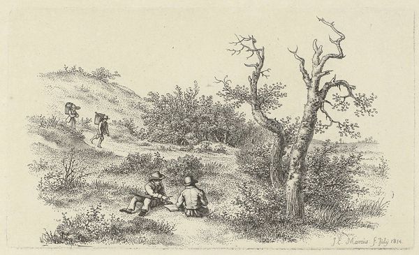 Curator: The light and shadow, captured meticulously in ink, immediately drew me to Jacob Ernst Marcus's 1810 drawing, "Figuren tussen bomen", housed here at the Rijksmuseum. Editor: The composition strikes me first. The scene feels staged almost, with a figure seated on the right looking pensive as if placed intentionally to balance out the interaction between the woman and kneeling man. What’s the dynamic at play here? Curator: It appears to depict an ordinary genre scene, but there's a hidden narrative suggested through the visual symbolism. Notice how the woman occupies a higher ground, almost supervising as the man retrieves water, hinting at social hierarchies perhaps, of their time. Also, the tree could symbolize stability, resilience, family ties, connecting nature with social constructs. Editor: Interesting. I saw it as an assertion of a constructed space; the artist emphasizes order, not nature—the meticulous linear strokes articulate and classify various objects and figures, rendering it static rather than a lively tableau. Even the seated man on the right could echo classic melancholic figure. Curator: That static quality you observe highlights how Romanticism, during this period, utilized genre painting not simply to replicate daily life but also to represent idealized and sometimes cautionary views of morality and societal order. What of the use of light and darkness, the chiaro scuro? Editor: It contributes to this sentiment. The darker areas frame and isolate the central action; note the lines of vision, too, each of the figures avoiding the other; creating this tension which enhances its structural unity while also injecting it with something more ambiguous, more uncertain in feeling. What message do you believe this artwork sends to its audience, reflecting as it does the spirit of Romanticism? Curator: Perhaps a call to return to simpler times while cautiously upholding established societal values amidst the tumult of early 19th-century Europe? I wonder. Editor: An enigma beautifully executed nonetheless. An ink drawing can convey this depth of ideas—I find that impressive.
