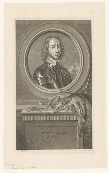 Curator: Here we have Étienne Ficquet's rendering of Pierre Corneille. The image is a small engraving, about 14 by 9 centimeters. Editor: My first impression is how neoclassical it feels, with the oval portrait and the laurel wreath, almost like a cameo. Curator: Indeed, it follows a formal tradition. Ficquet has created a symmetrical composition, employing line and texture to convey depth and importance through the visual language of heraldry and portraiture. But I also see a commentary on Corneille's societal standing. Editor: I see the composition that way too. But let's not overlook the Cupid, the eagle, the crown and books! All symbols denoting triumph, inspiration, and the accoutrements of court. It's all incredibly deliberate! Curator: And note Ficquet’s labor in translating Corneille's image into this reproducible format—a material act that extends Corneille's influence. Editor: Absolutely. It's interesting how these elements enhance the overall feeling of dignified classicism. Curator: Exactly, together they build a narrative about authorship and power. Editor: Yes. There is certainly an important interplay to consider between material and meaning.