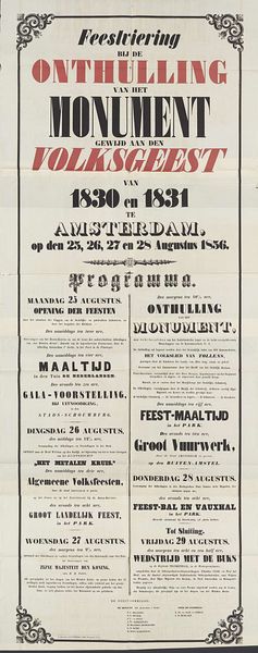 Editor: Here we have a print from 1874, "Historische gekostumeerde optocht te Amsterdam bij het 25-jarige regeringsjubileum van koning Willem III", created by Gebroeders Binger. It’s basically an announcement poster, and I’m immediately struck by how ornate the lettering is! What stands out to you in this piece? Curator: Ah, yes, a real typographic time capsule! You know, this isn’t just about conveying information, it’s about creating a feeling. The font they used, almost gothic, speaks to a sense of tradition and history. Look at how each letter is crafted. They weren’t just setting words, they were drawing them, breathing life into each curve and flourish. It whispers of a time when announcements weren't just scrolled past on a screen, but were events in themselves. Do you feel the weight of that history too? Editor: I definitely see what you mean about the weight of history, and how the lettering makes it feel grand, like a royal proclamation! The flourishes almost make it hard to read, though. Was that a common style then, prioritizing decoration over clarity? Curator: It’s a dance, isn't it, between legibility and artistry. Remember, this was a culture steeped in symbolism and visual cues. The decorative elements signaled importance, almost like visual punctuation emphasizing the significance of the event. And maybe a little difficulty to read also made people slow down, pay attention. Editor: That’s a really interesting point! I hadn't thought about slowing down as a deliberate choice. Curator: It makes you wonder about our own design choices today, doesn’t it? What are we sacrificing in the name of speed and efficiency? Editor: Absolutely, it makes you appreciate the craftsmanship and intentionality of something like this poster even more. Thanks for pointing that out.
