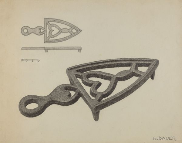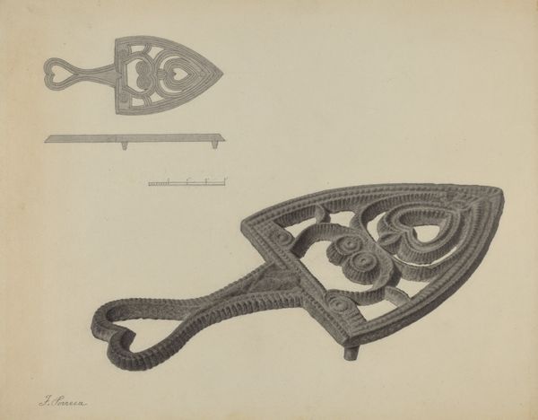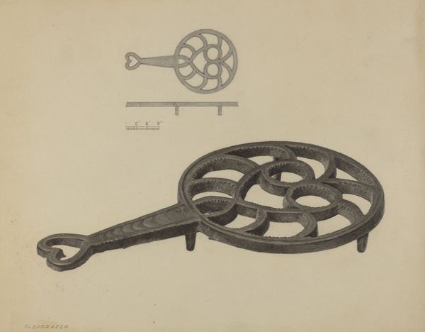 Curator: Here we have Jack Staloff’s pencil drawing, titled "Flat-iron Holder," created around 1937. The rendering focuses on the detailed design of the trivet, presented in two scales against a blank ground. Editor: It's so meticulous! The detail gives this humble object an almost reverential feel. There’s something soothing about the geometric repetition within the floral and circular motifs. Curator: Right. Everyday objects were often elevated through design in the 1930s, reflecting values placed on craftsmanship during periods of economic hardship. The geometric forms, the floral symbols...it feels linked to earlier decorative art traditions. Editor: Precisely! Those swirling shapes have this almost hypnotic quality, which in some cultures have stood for transformation and cyclical movement of life, all surrounding that central floral form which for so long has suggested natural cycles and even domestic comfort. Curator: I see what you mean, with its obvious utility but imbued with subtle visual significance. It speaks of pride in even the most mundane of tasks and possessions, an attempt to bring beauty to a very routine chore of managing the household. Editor: And think about it— the iron itself would have represented transformation, heat altering fabric to create new shapes and possibilities. This trivet, then, isn't just holding something hot; it is also holding a certain type of symbolic and practical weight. Curator: An interesting connection! It definitely shifts how we perceive the social function of even these modest, practical tools in everyday life during this era. The choice to create a precise technical drawing highlights this elevation, doesn’t it? Editor: Definitely. In viewing this common tool from the past as something sacred to present through geometric and detailed figures it transforms, right here, into a fascinating object and cultural reflection. Curator: Indeed, offering a window into how we assigned symbolic meaning to practical labor. Editor: A perspective I would never have expected from something so seemingly banal.