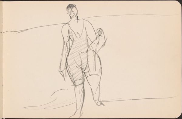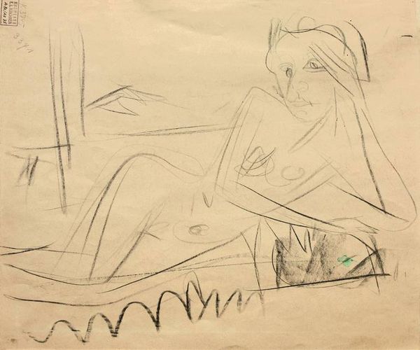 Ernst Ludwig Kirchner made this drawing of a nude bather with sailboat using waxy blue and orange crayons on paper. The artist's draftsmanship and deliberate composition elevate simple materials to fine art. The vibrant crayon lines evoke a sense of light and movement, capturing the essence of a fleeting moment. Kirchner applied broad strokes to establish the form of the figure and the surrounding scene. The inherent qualities of the crayon, its texture and opacity, lend themselves to a style of artmaking that values speed and spontaneity. The work's significance lies in its ability to bridge the gap between traditional drawing and modernist expression. With the marks of the artist's hand visible on the page, one can feel the energy and directness of Kirchner's creative process. By embracing the immediacy of crayon, Kirchner challenges traditional distinctions between fine art and everyday practices.