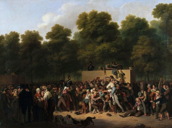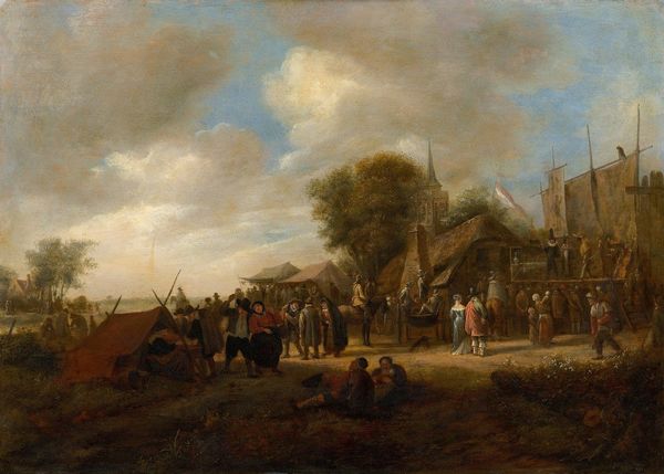 Jean-Antoine Watteau likely painted Soldiers on the March in the early 18th century in France, a period marked by social stratification and the lingering effects of war. This isn't your typical heroic depiction of military life. Instead, we see a rather mundane scene of soldiers and civilians on the move. Look closely and you’ll notice women among the riders. Consider the roles these women might have played, and their experiences amidst the upheaval of military campaigns. Watteau subtly acknowledges their presence, complicating the traditional narratives of war and masculinity. The artist himself occupied a unique position, catering to aristocratic tastes while also hinting at the complexities of contemporary life. This painting reflects a society in flux, where traditional hierarchies were being questioned, even as they remained firmly in place. It invites us to reflect on the personal stories embedded within larger historical events, and the diverse experiences of those caught in their wake.