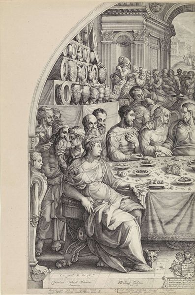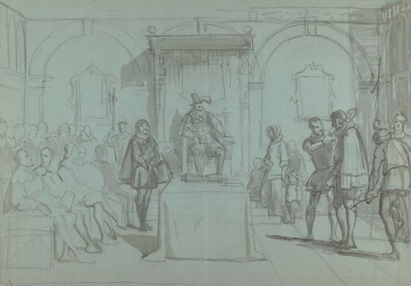 Wilhelm Marstrand created this pen and ink drawing titled "Selskabsscene, Chr. IV's tid," or "Company Scene, the Time of Christian IV," in the 19th century. Marstrand, a leading figure in the Danish Golden Age, often depicted historical scenes with a blend of realism and romanticism. Here, he imagines a gathering during the reign of King Christian IV, a period of cultural flourishing but also marked by social hierarchies. The composition, with its central table and surrounding figures, invites us to consider the dynamics of power and gender within this historical context. The men, adorned in elaborate costumes, dominate the scene, while the woman, though present, seems more constrained. Marstrand’s choice to represent this particular historical moment raises questions about how the past is interpreted and whose stories are told. His paintings often reflected the nationalistic sentiments of his time, yet also offer glimpses into the everyday lives and social interactions of people from different strata of society. What feelings do you think Marstrand was trying to evoke in the viewer?