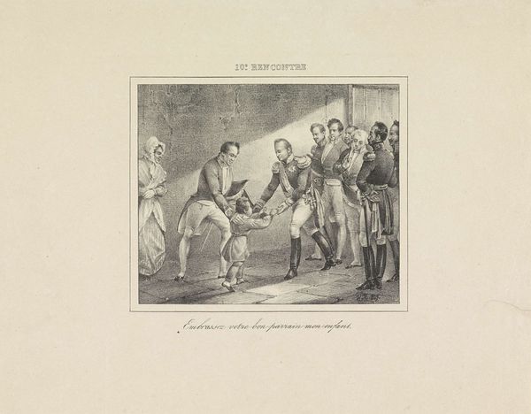 This print by Jean-Louis Van Hemelryck, made around 1829, captures a moment of social tension. It's rendered through etching, a process where lines are incised into a metal plate with acid, then inked and printed, creating a delicate but reproducible image. The choice of printmaking speaks volumes. Unlike a unique painting, prints are inherently democratic, allowing ideas to circulate widely. Here, the scene depicts King Willem I allowing a man with a petition to approach him, surrounded by other men. The print captures the tension between rulers and the ruled, with a strong sense of immediacy. Van Hemelryck has made design choices that emphasize the relationship between the different parts of the social order. The formal dress of the King and his retinue sharply contrasts the clothing worn by the common folk, making distinctions of labor and class apparent in the image. By using an accessible medium like etching, Van Hemelryck amplifies this dynamic, underscoring how materials and making can be deeply intertwined with the political and social context of their time. It reminds us that even seemingly simple images can carry complex messages about power and access.