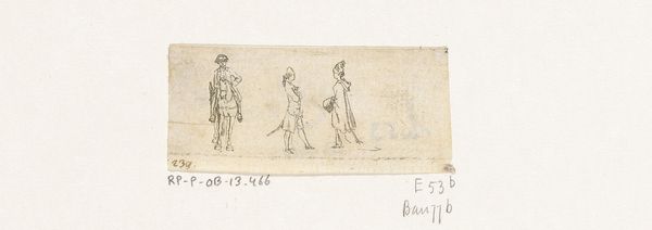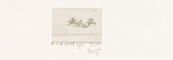Editor: This is "Fight Between Three Riders, One of Them Thrown From His Horse," created in 1769 by Daniel Nikolaus Chodowiecki. It appears to be a drawing and etching, and has a real sense of motion. What strikes you about this work? Curator: For me, it's the way Chodowiecki utilizes the material of etching – a relatively accessible printmaking technique – to depict what was typically considered high art, history painting. What does it mean to democratize historical narratives through reproducible, readily available means? Editor: That's interesting. I hadn't thought about the implications of etching versus, say, oil paint. Is there something about the roughness of the etching process that adds to the drama? Curator: Exactly. The scratchy lines and lack of precise detail push back against academic refinement, instead presenting a raw, almost reportage style of conflict. How does this shift in production impact how the content, this ‘fight’, is viewed and valued? Are we looking at it differently now? Editor: Yes, the choice of medium and its accessibility does change how I see it. It feels less like a glorification of battle, and more like a document, as you mentioned. What were etchings typically used for during this time? Curator: Often for book illustrations, political cartoons, or cheap reproductions of popular paintings. The medium was tied to commerce and dissemination of ideas to a broad public. Do you see that reflected in the artist’s use of lines? The clear attention to process and the visibility of the hand creating the art object? Editor: Definitely. It brings an immediacy to the scene. I guess, thinking about materials and methods this way shows that they are much more meaningful in constructing history than I previously imagined. Curator: Precisely! We see that "high" art themes and historical records are impacted through labor and dissemination, turning art itself into a process tied to social, and economic systems.
