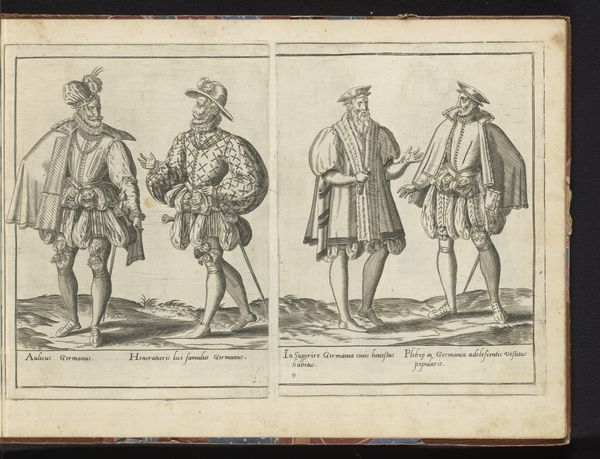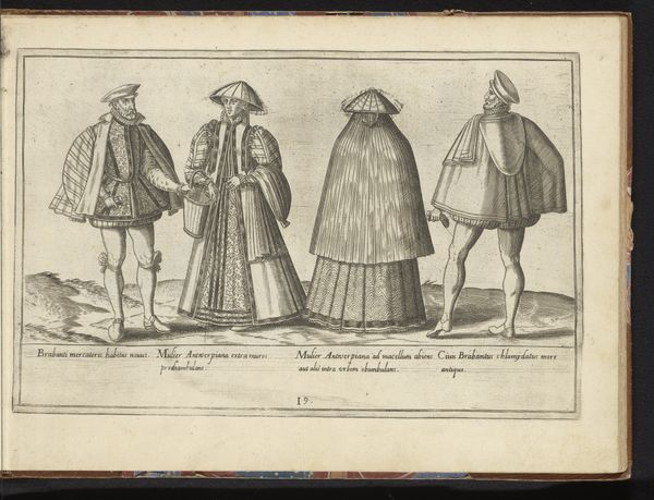 Curator: This print by Abraham de Bruyn, dating from before 1581, is titled "Four Country People Dressed in the Italian Fashion of circa 1580." It resides here at the Rijksmuseum. What are your first thoughts? Editor: They look like they’re straight out of a play! So stiff, self-conscious even. I mean, fabulous outfits, don't get me wrong, but there's this peculiar, almost theatrical, distance between them and us. They seem caught in a moment. Curator: The artist uses engraving to delineate each figure meticulously. Observe the clear outlines and precise details of the clothing, allowing us to study the sartorial codes of the era. Each stands independent of the other; notice that the space between them seems intentional, creating distinct formal arrangements. Editor: You are right. They're more like meticulously labeled specimens. Each crease, each fold tells a story—though I’m not sure what it is, precisely! The artist certainly had an eye for fabric; I mean, look at the way light seems to catch on the puffed sleeves! And those hats! Utterly divine. Curator: It seems De Bruyn deliberately avoids imbuing any anecdotal warmth within the image, as if prioritizing details of garments over emotions or expressions. Through the figures’ constructed symmetry we see clear markers of status. The formal composition suggests we’re dealing with types, or rather models, of regional identities and cultural fashion. Editor: Models is the right word! Perhaps like early fashion plates. There’s something appealing in the strangeness of their almost cartoonish presentation; that hyper-clarity almost transforms into something else. Like looking at historical emojis! It strikes me also, these faces and figures reflect an idea of place – something perhaps truer to concept rather than actuality. Curator: It is a striking observation. The artist sought less to capture lived reality, but perhaps a semiotic field: signifiers of the rustic experience. Editor: A semiotic field – yes! Still, one can't help wonder about the real lives behind those severe stares and elaborate costumes. But maybe, that's not the point. Perhaps this print is an invitation, even if unconsciously, for us to see beyond the lines. Curator: A fitting reflection on a fascinating piece that highlights how cultural identities can be formed, viewed, and conveyed. Editor: Indeed. De Bruyn has opened up, even after all this time, many avenues for reflection and, not a little, personal projection.