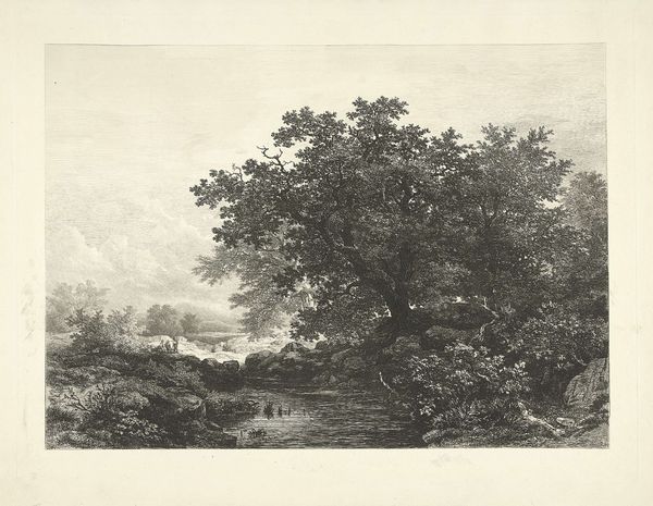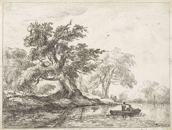 Franciscus Andreas Milatz created this landscape etching, "Landschap met hoge bomen langs een rivier," using delicate lines to define form and texture. The composition is anchored by the large trees that dominate the foreground, their canopies filling the upper portion of the frame. The artist's etching technique renders a complex interplay of light and shadow, giving depth to the foliage and implying movement in the leaves. The eye is drawn along the river, which winds into the distance, balanced by the placement of figures along its bank. Milatz masterfully uses linear perspective to create a sense of depth and to structure the composition. The river recedes, and our gaze follows it into the background. The structural arrangement invites reflection on how landscapes can be both a scene and a constructed space, prompting considerations of nature as both a physical reality and a symbolic construct. In its formal structure, this etching offers an ongoing exploration into the nature of seeing and interpreting the world around us.