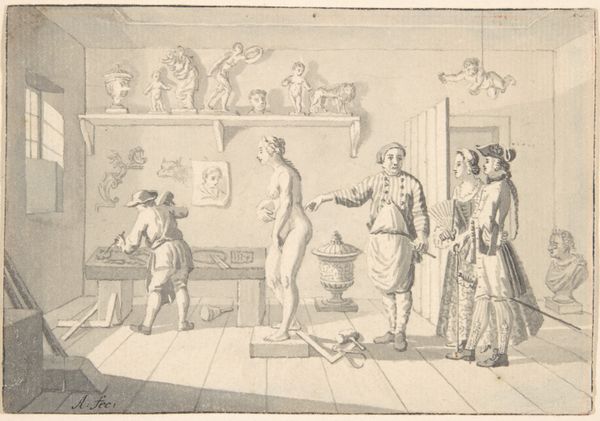 Editor: This is "Interior of the Inn in Lapide near Brindisi" created by Louis Ducros in 1778 using ink on paper. It has a very matter-of-fact feeling. Everyone is in their own world, doing their own thing, with a definite emphasis on labor, wouldn’t you agree? What stands out to you when you look at this drawing? Curator: Certainly. Note the variety of actions, yet each rendered with a similar weight. We should consider the material reality of an 18th-century inn. This isn't some romanticized vista. Consider Ducros's choice of ink—practical, readily available. The paper too, serves as a surface that absorbs and reflects light, a direct contrast to the lives lived within those walls. Where did Ducros source these materials, and how might the location of that labor affect what’s represented? Editor: So you're less focused on the scene depicted, and more on the creation itself. That's really interesting, looking at it now I hadn’t thought about the ink and paper choice itself as a potential commentary. Curator: Exactly. Consider those animal hides on the wall. Their very presence points to processes of animal slaughter, skinning, and tanning. Their utility transcends decoration and leads us back to questions of human needs and raw production within the economy of everyday life. Editor: That’s fascinating. It is almost like he is deliberately forcing us to notice them. Curator: The interplay of figures, from the drinking men to the mother with her child, reflects specific social relationships dictated by necessity, the division of labor within that small community. What needs are being fulfilled? What system facilitates this moment of time and place? These are questions evoked by the careful arrangement and documentation. Editor: It really changes my view. Initially I just saw it as a glimpse into a past, but it's so much more intentional than that. Now it feels like he has made sure nothing gets left out of view in terms of manufacture. Curator: Precisely, we begin to unravel assumptions and confront ourselves with realities beyond simple representation. This is something Ducros makes undeniably clear for us.