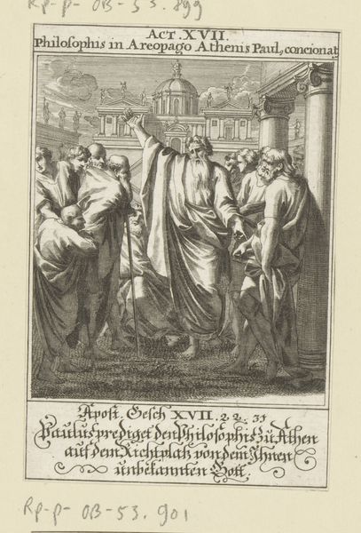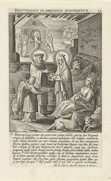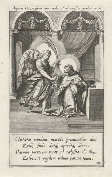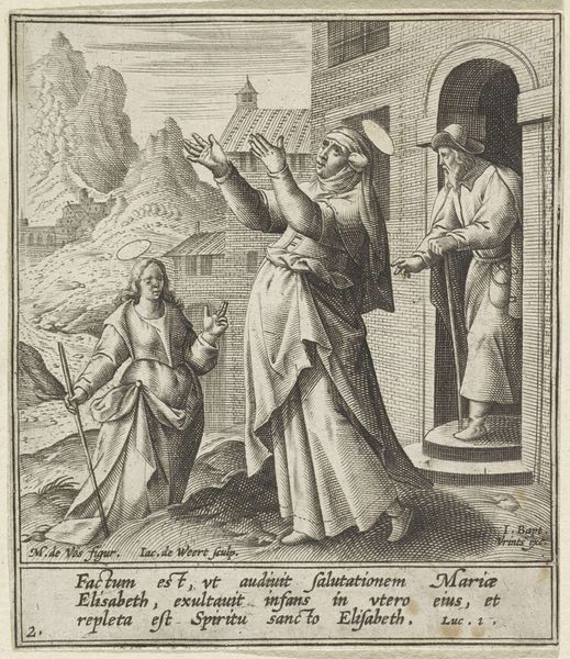 Jacob de Weert made this small print, ‘Aankondiging aan Zacharias,’ using engraving – a process of incising lines into a metal plate, inking it, and pressing it onto paper. The sharp, precise lines create a wealth of detail, from the folds of the angel's robes to the texture of Zacharias’ beard. The act of engraving requires intense focus and control, each line carefully considered. This painstaking process reflects the importance placed on disseminating religious stories through print during this period. The very act of replicating images like this, making them accessible to a wider audience, transformed their cultural significance. Notice how the medium itself, with its inherent linearity, dictates the aesthetic. The image is built up from a network of hatched lines, creating areas of light and shadow. It’s a testament to the engraver's skill that they could achieve such nuanced effects with this method. Looking at this print reminds us that the message is inseparable from the medium.