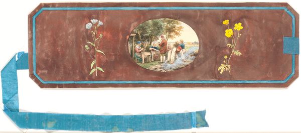 Henri-Joseph Harpignies created this watercolor work, "Travelers on a Wooded Path with a Border of Whimsical Figures and Monkeys", on an inverted fan-shaped sheet, presenting us with a playful intersection of landscape and decorative design. The composition is neatly divided: a tranquil wooded path occupies the central space, framed by an ornate border of whimsical figures and monkeys. Harpignies uses fluid washes of color to evoke a serene, almost dreamlike atmosphere. The path, rendered in light, muted tones, draws the eye into the distance, while the darker, looming trees on either side create a sense of enclosure and depth. The border, with its lively figures and vibrant blues, contrasts sharply with the subdued palette of the landscape. This juxtaposition highlights the artificiality of the decorative frame, questioning the relationship between nature and artifice. Is Harpignies suggesting a dialogue between the untamed wilderness and the human desire to contain and order it? The fan shape itself further complicates this dynamic, transforming a traditional object of leisure into a canvas for exploring the boundaries of representation.