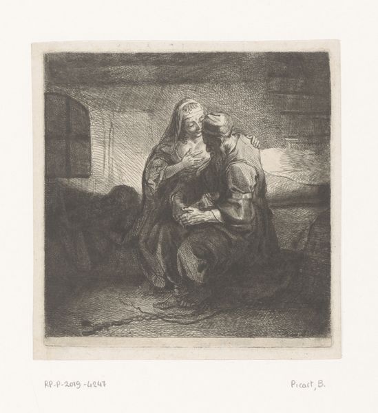 Editor: This etching, "Pero suckles the imprisoned Cimon" by Bernard Picart, made between 1683 and 1733, has such a striking image of quiet intimacy amidst despair. It's so moving! How do you interpret this depiction? Curator: Well, the subject is drawn from Roman history – specifically Valerius Maximus. We see a daughter, Pero, secretly breastfeeding her imprisoned and condemned father, Cimon, who was sentenced to death by starvation. How do you think an audience in the 17th or 18th century would have reacted to this scene? Editor: I imagine they would see it as an incredible act of filial piety and female strength, going against societal expectations for the love of family. Curator: Precisely. The story circulated particularly widely in the 17th and 18th centuries because it reinforced values surrounding charity and self-sacrifice. Images such as these encouraged discourse and action on public assistance and charitable behavior. Consider how frequently themes of piety appeared across varying levels of society – it played a role in shaping social identities. Editor: That’s fascinating. It’s almost like the artwork served as propaganda, reminding people of their societal obligations? Curator: It goes beyond simple propaganda. It engaged viewers on an emotional level, prompting them to consider their own values. Also, bear in mind, engravings like these often circulated widely, thus broadening the impact beyond an elite audience. Editor: I see what you mean, it’s about establishing moral frameworks within a culture. I didn’t initially consider how an image, produced as an etching, becomes a political tool beyond purely aesthetic experience. Curator: Exactly, art rarely exists in a vacuum, does it? Understanding that political dimension makes it richer and more complex.