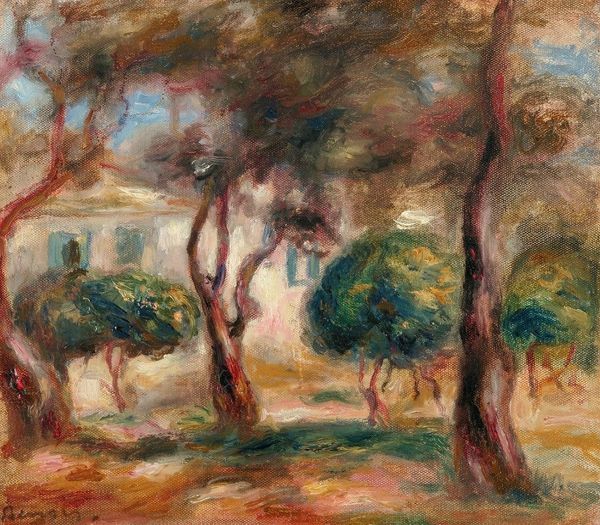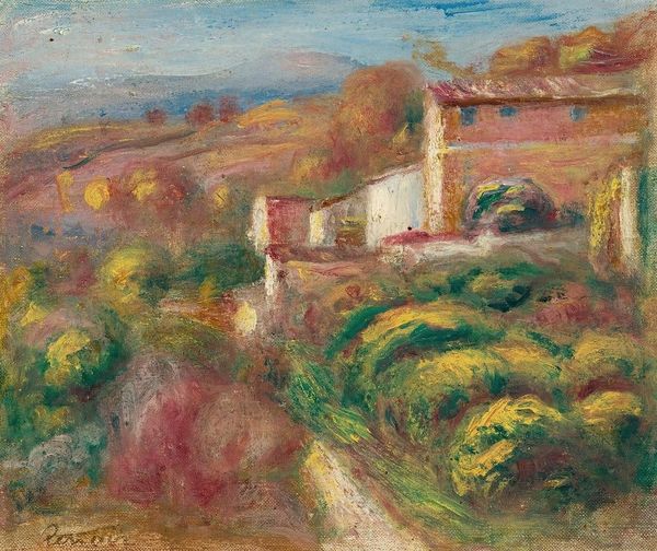 Pierre-Auguste Renoir painted ‘Paysage Avec Maisons’ with oil on canvas, capturing a landscape bathed in a soft, diffused light. The painting is a tapestry of blended colors and textures, evoking a sense of warmth and intimacy. The composition is structured by a series of rolling hills and clusters of houses, each rendered with short, broken brushstrokes characteristic of Impressionism. Color functions here not to define objects, but to convey an overall impression of the scene. Patches of pink, yellow, and green blend to create a vibrant, yet harmonious landscape. The materiality of the paint itself becomes a focal point, with visible strokes adding texture and depth. Renoir's approach to form destabilizes traditional landscape painting. The scene isn't depicted with sharp realism but through a synthesis of color and light, transforming it into a subjective experience. The painting challenges fixed notions of space and perception, inviting viewers to immerse themselves in the fleeting moment. The emphasis on the sensory experience aligns with the broader artistic concerns of the time, reflecting a shift towards personal expression. This artwork serves as an ongoing invitation to interpret and appreciate the interplay between color, form, and perception.