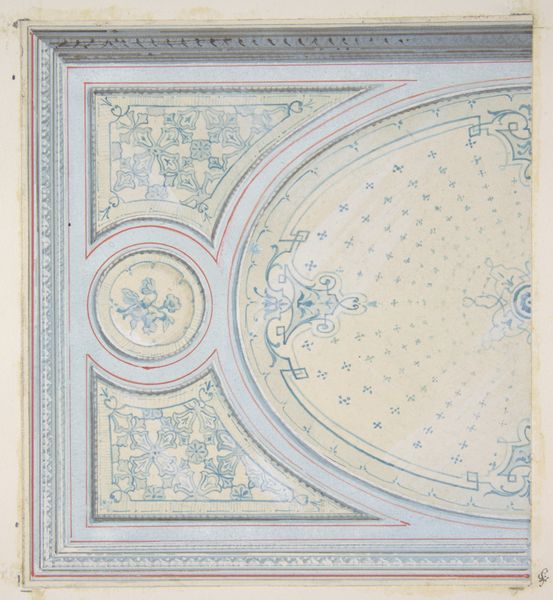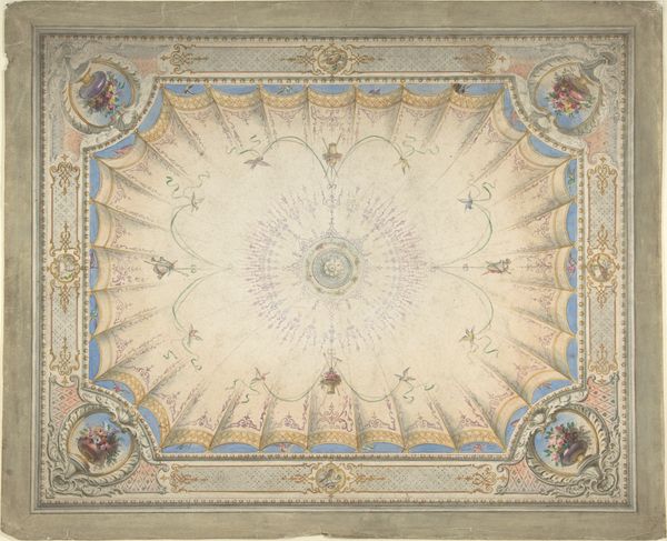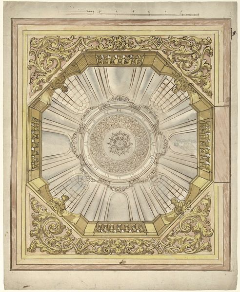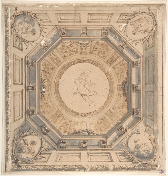 Curator: What an intricate sketch! This is "A Ceiling Decoration with Landscapes and Battles" by Lazzaro Tavarone, dating from around 1620. It’s a mixed-media drawing, employing watercolor and colored pencil, offering us a glimpse into the artistic process behind grand Baroque ceilings. Editor: My immediate impression is one of elaborate preparation. You can almost feel the weight of the narratives intended for that vast, expansive surface it was designed for. There's a symbolic tension too, between the grounded battle scenes and the airy landscapes. Curator: Indeed. As a ceiling decoration study, it speaks to the societal function of Baroque art itself – a persuasive display of power and erudition. Consider how illusionistic ceiling paintings reinforced the authority of the patron, be it church or noble family. Editor: Absolutely. And the very composition channels the viewers' gaze upward, towards an idealized, divinely sanctioned realm. I’m particularly drawn to the war scenes and idyllic landscapes – how do they speak to one another in your eyes? The violent and the peaceful. Curator: The battles would resonate with contemporary political events and the patron's lineage, showcasing their strength and valor. The landscapes, simultaneously, evoke harmony and divine order – juxtaposing earthly struggles with aspirations towards celestial peace. The interplay mirrors Baroque drama, inviting meditation upon morality and the course of history. Editor: The cherubs positioned between scenes are noteworthy. Aren't they recurring characters within these visual languages, often acting as messengers between worlds and between ideologies? Curator: Precisely. They also suggest, with their positioning in the design, that conflict and serenity were ever-present and intertwined, perhaps even two faces of the same social structure. Tavarone captured an entire worldview here! Editor: Thinking about the battles, the strategic composition of conflict and peace, they feel like a negotiation of contrasting impulses, something embedded deeply within human experience. I come away feeling very attuned to the complex layers of experience represented here. Curator: For me, understanding Tavarone’s intent and the drawing's subsequent reception requires that we interpret it as part of broader patterns of patronage, viewership, and political maneuvering in Baroque Italy. A beautiful, thought-provoking demonstration!