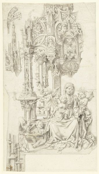 Curator: This intricate pencil drawing is "Ontwerp voor een grafmonument voor Margaretha van Oostenrijk," or "Design for a Tomb Monument for Margaret of Austria," created between 1543 and 1556 by Lancelot Blondeel. Editor: My first impression is one of sombre grandeur. The composition is dominated by strong verticals and horizontals, creating a sense of architectural stability that belies the mournful scene depicted. Curator: Absolutely. Note the Renaissance architectural framework—the columns, arches, and elaborate ornamentation. Blondeel is meticulously laying out not only representational figures but an entire symbolic structure. What draws your eye? Editor: Well, for me it's impossible to ignore the power dynamics at play. Margaret of Austria is depicted kneeling before a female figure holding a staff or scepter, a likely personification of piety or power, depending on the interpretation. Margaret’s pose—one of submission or supplication—within the very design of her final resting place, speaks volumes about the performance of piety expected of female rulers at this time. Curator: Interesting. Semiotically, the arrangement presents a clear hierarchy reinforced by gesture and positioning. Notice too the almost diagrammatic representation of drapery; the artist gives precedence to the linear unfolding of these shapes as opposed to representational realism. Do you read any symbolic charge into those choices? Editor: I think the treatment of the figures is purposeful, it’s calling our attention to something beyond the purely representational. This could signal how rulers navigated personal desires within restrictive political and social contexts. But beyond all this, is this positioning simply another calculated manoeuvre intended to solidify her place in history? Curator: Possibly. The artist has crafted a monument, and it's difficult to know whose intention is guiding these details. I wonder how the public perceived this work. How can they connect it to what they believe, given the social norms imposed onto people, when faced with artworks, and specifically those created in the Renaissance? Editor: Food for thought. The act of commissioning art, especially memorial art, involved intricate negotiations of identity, authority, and legacy—Margaret’s story continues to resonate in that vein. Curator: Indeed. Through form and placement, Blondeel’s drawing is as much a visual essay on power and authority, as a plan for an artwork. Editor: And, for me, that duality of purpose transforms the work from a mere tomb design into an incisive historical commentary.