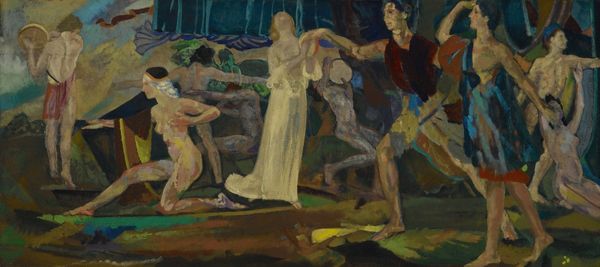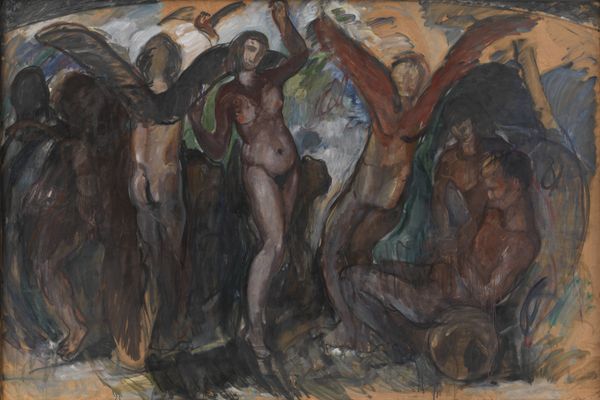 Curator: Henri de Groux's lithograph, “Christ Among His Tormentors," dating from 1894-1898, presents a dense, swirling composition. My first impression is its sheer visual chaos. It feels overwhelming, almost claustrophobic. Editor: Overwhelming is certainly a fitting description. De Groux uses the narrative of Christ's Passion as a lens through which to examine human cruelty. Notice how the composition pulls you in with its frantic energy—all those faces, compressed and contorted! The symbols—the chalice, Christ's halo, even the prostrate serpent—anchor the meaning in familiar iconography, though interpreted through a modern, angst-ridden sensibility. Curator: From a purely formal standpoint, look at the layering of the figures. The density, achieved with lithographic techniques and the application of color, is not just about depicting a crowd. The crowding creates an overall texture, one that speaks to the violence of the scene, doesn't it? There's no serene central point; the composition eschews classical harmony. Editor: Precisely! Harmony is deliberately absent here. Consider how de Groux portrays Christ, surrounded by jeering figures. His is not a traditional pose of stoic suffering. Instead, he's almost lost, one figure amongst many. He's still haloed in divinity, but the tormentors clearly dominate the immediate symbolic space, signifying the very human and societal rejection of the sacred. Even the peripheral, sketch-like drawings evoke additional symbolic resonance. Curator: Agreed. The dynamism generated between these zones--the highly worked central action versus the ghost-like traces framing it--creates compelling visual tension. It moves between solid form and a kind of dissolving, unstable space. Editor: In art historical terms, "Christ Among His Tormentors" resonates with late 19th-century Symbolism and its preoccupation with inner experience. De Groux uses historical narrative as a vehicle to probe psychological and cultural themes related to betrayal, moral corruption and humanity's latent capacity for cruelty. Note how he draws upon recognizable religious symbolism to express such concepts through emotionally charged imagery. Curator: Examining the arrangement and application of color gives us an appreciation of the emotional distress that characterizes symbolism and post-romantic aesthetic values in that specific moment of European history. The composition gives us ways to investigate these symbolic expressions, too. Editor: An artwork demanding consideration of symbols and also offering the possibility of more formal interrogation of structure.