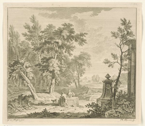Editor: So, this is "Landschap met visser," or "Landscape with Fisherman," a print made by Michiel Elgersma sometime between 1700 and 1759. It's really detailed. The ruins in the background and the people in the foreground feel like they're part of two completely different worlds, and that makes it seem melancholic to me. How do you interpret this landscape? Curator: I see a dialogue between the past and present, encoded within this serene scene. Notice the fisherman – a timeless symbol of simple existence – juxtaposed against crumbling classical architecture. Consider those ruins, standing as spectral reminders of fallen empires and past glory. Do you recognize any other symbols? Editor: Well, the figures in the foreground, they seem almost carefree, relaxing, and unaware of the grand history that surrounds them. Is that intentional? Curator: Precisely! Elgersma uses this contrast to explore our relationship to the past. These ruins carry powerful emotional and cultural weight. The idyllic scene overlaid upon the decay raises the question: How much of our present is haunted, or informed, by what came before? The symbols work on both conscious and subconscious levels, planting ideas in our collective cultural memory. Editor: I hadn't considered the ruins as a commentary on memory. So, is the image saying that even in our most peaceful moments, history subtly influences our perceptions? Curator: Exactly. The layers of time converge in a single frame. We witness both a celebration of the natural world, but also a sobering reflection of the temporal nature of human achievement. Editor: That adds a whole new layer of depth. Thanks for sharing your insight, I will keep that in mind moving forward. Curator: And I appreciate your observations; they highlighted fresh perspectives. The journey through art is always a shared exploration, isn't it?