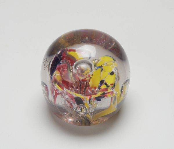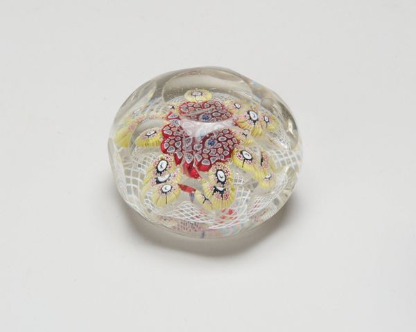 Editor: We're looking at "Paperweight," created around 1850 by the Saint Louis Glass Works. It's a mesmerizing glass sculpture, quite geometric, like a colourful galaxy contained in a sphere. It almost feels like a time capsule, frozen in glassy perfection. What catches your eye when you look at this, uh, orb of controlled chaos? Curator: "Controlled chaos," I love that. It reminds me of looking into a kaleidoscope – infinite patterns born from limited components. This paperweight, for me, embodies the Victorian fascination with containment. Think about it - intricate worlds under glass domes, pressed flowers, pinned butterflies. The paperweight neatly, if ironically, mirrors the ambition of the era to classify, curate, and ultimately, control the natural world. I find that profoundly poetic, don't you? Editor: That's such an interesting idea! I was focused on just how *pretty* it is. The little flowers trapped inside seem so delicate. But your interpretation really flips it for me. Do you think it might also reflect the rapid industrial growth of the time? Everything in perfect, manufactured order? Curator: Absolutely. Glassblowing itself became a symbol of that very controlled industry. Remember, these paperweights weren't cheap baubles. They spoke to a certain aspirational elegance. What stories do you think it could tell, if it could talk? Editor: Probably secrets whispered across desks, or maybe just observing forgotten letters and bills. Curator: Maybe someday *we* will be trapped in glass and observed… food for thought. Thank you, it was so insightful exchanging ideas on this artwork with you. Editor: Yes, same here. Thanks! This paperweight’s making me look at more than just surfaces.