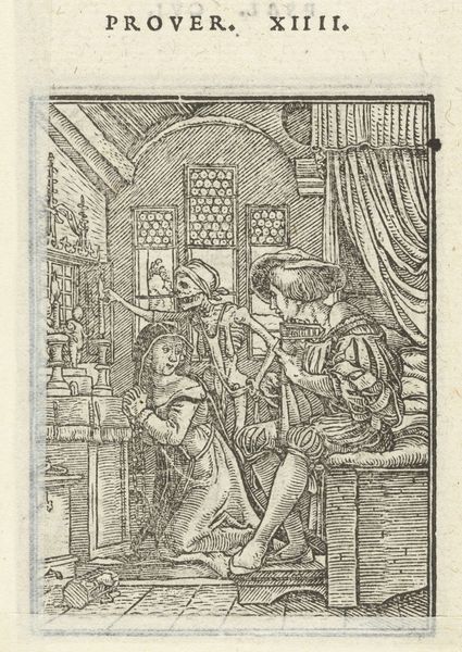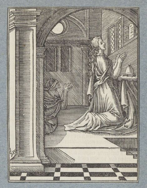 Curator: This compelling woodcut print, crafted sometime between 1483 and 1531 by Hans Burgkmair, depicts “Solomon Worshipping an Idol”. What strikes you most about this figural scene? Editor: The weight of the story, instantly. There's something very human and frail in Solomon's posture, you can feel the inner conflict etched onto his face and posture, though the execution feels distant, almost… archetypal? It also speaks to how the smallest of visual inputs have the power to evoke a range of feelings and ideas in our own time. Curator: It’s fascinating that you point that out! Burgkmair really harnesses the language of symbols here. Note how Solomon’s gesture of supplication to the idol speaks of surrender not only to foreign gods, but perhaps also to the persuasive influence of his wife—it echoes through the centuries: familial relations trumping ideals, or the idea of broken alliances, still hitting hard today. Editor: The repetition of figures adds a formal, symbolic touch, as though the event repeats over and over as a kind of psychological loop. There’s the weight of judgment hanging in the air – that statue is really just an ominous stand-in for an inevitable guilt, dooming him for generations to come. Also, in this crisp black and white, there are shadows, making the print oddly atmospheric. Curator: I find it intriguing that this work exemplifies how printmaking played a vital role in spreading biblical narratives during the Northern Renaissance. Its symbolic and accessible visual language aided the transmission of religious concepts, while its style reflects the detailed linear quality cherished during the era, all contributing to the broader dissemination of morals and values, right? Editor: Precisely! This relatively small print, likely intended for mass circulation, showcases the potent reach of imagery in shaping cultural memory. Thinking of Burgkmair's artistic choices, especially how the space is compressed around them – makes it feel like a stage set. Very conscious and artful! Curator: Yes, there’s such an interweaving of psychological tension and cultural memory imbued in the work! What a powerful way for an image to both illustrate and indict. Editor: Absolutely. I walk away seeing Solomon as this representation of someone burdened, succumbing, in the eye of a brewing symbolic storm.