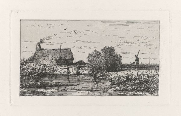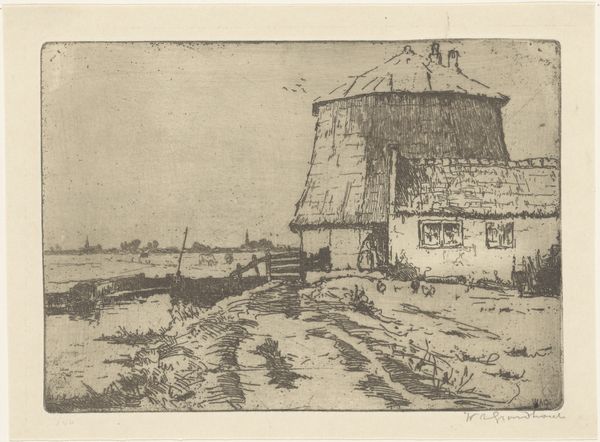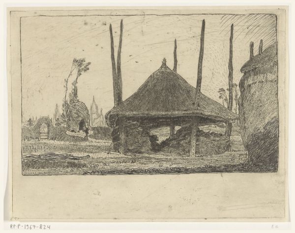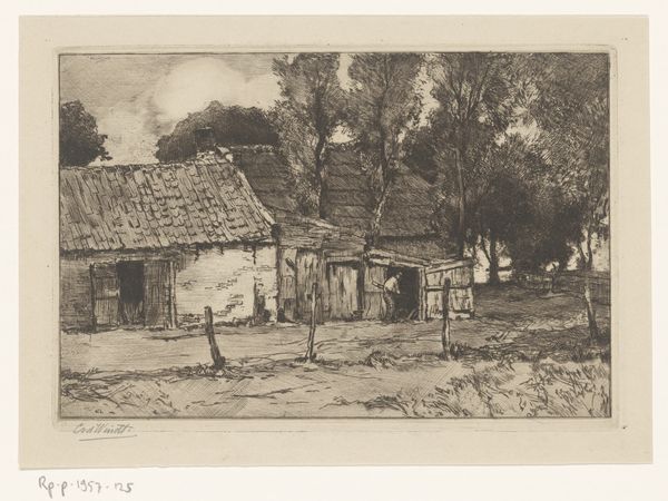 Editor: This etching, "The Farm Yard," was created in 1895 by William Strang. It depicts a figure working in a rural setting. It is such a stark composition, I’m curious how you see it? Curator: Let us first observe the strategic placement of light and shadow. The artist's control of line weight directs our gaze across the plane. The clustered lines, aren’t they compelling as they define form, establishing depth and suggesting volume. Observe the buildings—they don't recede so much as establish depth through contrast. Editor: So, the buildings in the back, set atop what looks like a hill or a raised elevation, work in tandem with the structure nearest the viewer? Curator: Precisely. They interact within the picture plane. This print displays an acute awareness of structure, with tonal variation, using lines with great efficiency. Consider how he implies the form of the person within very economical marks. Note how he uses a series of parallel lines in the background, but not too close, in order to provide shading, setting up a stark contrast to the subject in the yard. Editor: Right. He really conveys a sense of depth through contrasting detail. It's clever how he builds the composition this way using varied density of line! Curator: It exemplifies a carefully constructed interplay between dark and light and their strategic alignment to compose the scene. The whole, therefore, becomes more than the sum of its parts, presenting not merely an image of a farm, but a dynamic interplay of formal relations. What do you think of that assessment? Editor: That’s a new way of seeing it for me. The emphasis on technique shows just how much thought went into its rendering. Curator: And that, in essence, defines the piece as more than just a scene of rural life.
