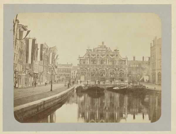 Editor: This gelatin-silver print, “Gezicht op Hotel de Doelen in Amsterdam,” made sometime between 1860 and 1890 by an anonymous photographer, really captures a moment in time. I'm immediately drawn to the tonal range in this landscape and how the composition guides my eye from the still water to the imposing structure of the hotel. What do you see in this piece? Curator: Formally, the photographer has employed the stillness of the water as a pictorial element to provide a stable foundation, a dark foil to reflect the building's architecture. Note how the vertical thrust of the Hotel de Doelen is subtly mirrored by the lampposts and masts of the boats. Consider the texture and materiality, particularly how the gelatin-silver printing process renders a nuanced spectrum of grey tones. How do those contribute to the overall effect? Editor: It gives a timeless quality, a dreamlike vision of Amsterdam. Does the choice of viewpoint add to its sense of structure? Curator: Precisely. The vantage point allows for a measured recession into depth, with each plane—water, hotel, bridge—clearly articulated, providing structural stability. Notice, also, the tension between the sharp details in the foreground and the gradual softening toward the background; a conscious manipulation of focus to suggest depth. Editor: So it’s less about capturing a specific moment and more about building an image through its intrinsic elements. Curator: Exactly. The photograph transcends documentation to become an essay on form and the interplay of light and shadow, of surface and depth. Its success lies not in what it depicts, but in how it’s constructed. Editor: I hadn’t considered the composition so deliberately, thank you for making it visible. Curator: My pleasure. Considering structure enables access to new appreciation.