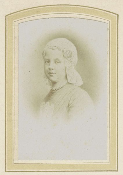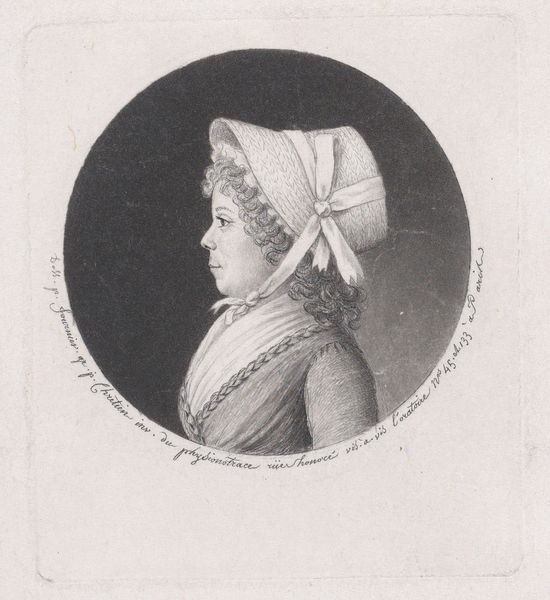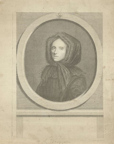 Curator: Welcome. We’re looking at Félix Bracquemond’s etching, “Portrait of Henri Houssaye, as a child," created sometime between 1855 and 1860. It’s a charming example of realism from the period. Editor: Yes, "charming" is one word. My initial impression is of muted stillness; the somber tones amplify a vulnerability in the child's expression. Notice how the oval frame further concentrates our focus. Curator: It's more than just charm, though. This etching captures the ethos of childhood portraiture in the mid-19th century, especially amongst the bourgeoisie. These images served to project a certain image of gentility. Editor: Gentility through melancholic constraint? Look at the fine, almost oppressive, network of lines—it's visually restricting. It lends a seriousness beyond his years. I can almost feel the weight and texture of that headscarf through the artist's use of shading and line. Curator: Consider what these portraits communicated about family values. Portraits like this weren’t casual snapshots. They were deliberate constructions, symbols of familial pride. Bracquemond wasn’t just portraying a child; he was solidifying a family’s social standing. Editor: That's one frame. Visually, the light is distributed unevenly, almost theatrical. It seems to capture a fleeting moment; there is drama in the way the shadows fall around the face, adding depth to this study in texture. Curator: Etchings democratized portraiture, making it accessible to a wider audience, solidifying photography's emergence, even while offering a similar way to immortalize family members in their best light. Editor: I can appreciate it, the light, texture, and the somber expression captured with stark visual means and yet, I am moved and unnerved by the very effect it creates in totality. Curator: I find it fascinating how a seemingly simple portrait encapsulates such broader societal trends and anxieties around class and family. Editor: And I am compelled by Bracquemond’s delicate lines and powerful tonal shifts; he coveys that which words cannot fully grasp.
