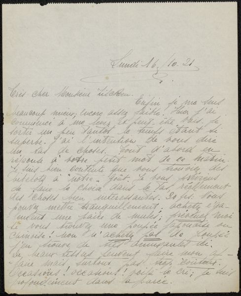 Curator: This is a letter titled "Brief aan Philip Zilcken," which translates to "Letter to Philip Zilcken," created sometime between 1911 and 1930 by Rose Imel. It is written using pen and ink on paper. Editor: The slant of the handwriting gives me an immediate impression of urgency. The close-packed lines and consistent darkness of the ink point towards a deliberate flow of thought. It seems very intimate. Curator: Absolutely. The materiality of the paper itself, and the fact that this is handwritten, speaks volumes about the time and care taken in its production. The embodied labor is evident, especially compared to today's ease of digital communication. Editor: Indeed. But beyond the effort, I’m drawn to the shapes of the letters. Notice the elegant loops and sharp angles, creating a dynamic visual rhythm across the page. How these individual graphic marks come together into such meaningful forms and conveys not only language, but emotion. Curator: We might also consider what the constraints of the materials imposed on the writer. Was there limited paper, necessitating the close handwriting? What pen was used, and where was it produced? Such constraints often directly shape the aesthetics. And let's not forget the role of the postal system itself, the vehicle for conveying this message through space and time! Editor: Fair points, but the focus on production shouldn’t overshadow how these graphic forms, these signs and signifiers, ultimately point to an intentional message, directed to a single receiver. A dance, it seems, of purpose and passion across time itself. Curator: And a poignant reminder that communication is rarely ever a straightforward or neutral act. Understanding the context of its creation adds another layer of depth. This has been a letter to consider as more than merely its formal qualities. Editor: A compelling exchange that invites us all to contemplate how letters intertwine the practical and the beautiful, the individual and the social, the ephemeral moment and an enduring art.