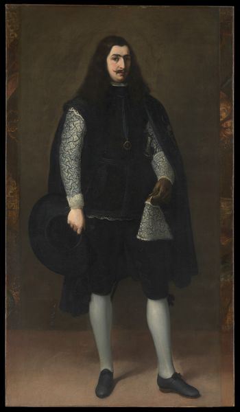 Curator: Looking at this artwork by Sofonisba Anguissola, created around 1557, what's your immediate reaction? This is a portrait of Massimiliano Stampa; the painting currently resides at the Walters Art Museum in Baltimore. Editor: Intriguing. I’m struck by the somber stillness of the piece. The predominantly dark clothing against the plain background creates a muted palette, and yet, there's something deeply unsettling in the subject's gaze. What sociopolitical constructs was Anguissola engaging with in her portraiture? Curator: Anguissola was, as we know, a very rare thing: a woman gaining international recognition as a painter in the 16th century. Placing this work in that context makes us consider the ways in which elite gender norms shaped artistic practices, but more generally, who had the power to be portrayed at all. Consider the dog here – often a symbol of loyalty and fidelity – seemingly asleep at Massimiliano's feet, reinforcing a particular narrative of aristocratic virtue, while perhaps alluding to colonial conquests. Editor: The dog’s sleep evokes something else though: indolence. Aren’t animals, and our representations of them, more generally culturally loaded signifiers? How much weight do you give to the presence of that column too, perhaps signaling not just status and lineage but also... instability? Curator: The column base seems awkwardly placed, you're right! And in this work it surely represents a disruption of conventional portraiture, a subversive challenge. But looking closer, it serves to place him within a specific architectural and social landscape. His clothing signals affluence and power. Yet there's a tension. He’s clearly privileged, but that expression… he appears burdened rather than triumphant. Editor: Exactly! We need to contextualize that "burden" - how does this image either confirm or subtly subvert existing hierarchies of power and class? It invites us to unpack the hidden complexities behind aristocratic portraiture, beyond a simple, honorific representation. Curator: So it pushes beyond an objective representation of a wealthy boy, forcing us to question what’s left unsaid about power, identity, and perhaps the performative nature of masculinity in the Renaissance. Editor: Agreed. The piece stays with you, provoking difficult questions that extend far beyond simple aesthetics. I'll never look at such formal aristocratic portraits in quite the same way.