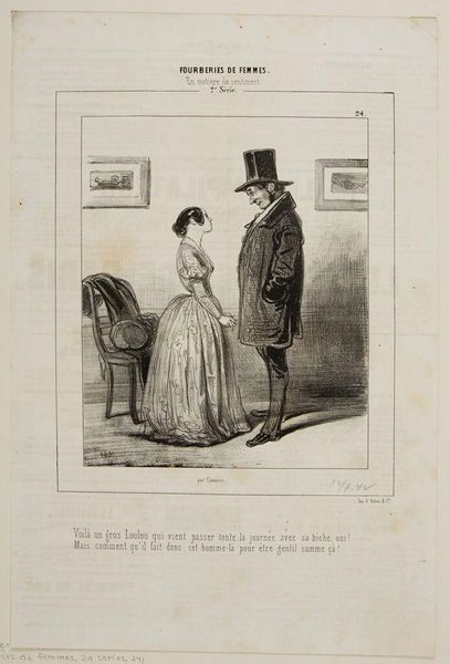 Editor: This print, "You were right, my wife . . .," by Paul Gavarni, depicts a bourgeois couple encountering someone. It feels like a commentary on social class. What do you see in this piece? Curator: It's a potent glimpse into 19th-century social dynamics. Gavarni often satirized the bourgeoisie, and here, we might consider the power dynamics at play in these encounters. Who is seen, who is ignored, and what does that say about societal structures? Editor: That's a fascinating point! It definitely adds another layer to my understanding. Curator: How might gender also factor into the interpretation, particularly in relation to the gaze of the figures depicted? Editor: I hadn't considered that! It makes me rethink the whole scene. Curator: Exactly! Art invites us to constantly question and re-evaluate our perspectives, acknowledging the historical and social contexts shaping these images. Editor: I'm learning so much – thank you!