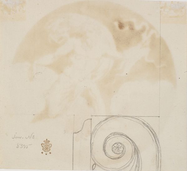 Editor: We're looking at "A Winged Genius Hovering Over a Globe, Indicated by a Pair of Circular Arcs," a pencil drawing on paper created between 1743 and 1809 by Nicolai Abildgaard. The delicate lines and somewhat unfinished quality give it an ethereal feel. How do you interpret the artist's choices in terms of composition and technique? Curator: I appreciate your initial observations regarding the ethereal quality, directly linked to the artist's technique. Note how the figure’s dynamic pose, coupled with the globe’s rudimentary depiction, generates a fascinating tension between movement and stasis, precision and ambiguity. Do you observe anything in the treatment of light and shadow? Editor: It looks like he only hinted at shading, perhaps to emphasize the form, rather than volume? I see the faintest marks inside the globe, and small darker marks under the angel. It almost feels as though he wants us to focus on the overall design rather than minute details. Curator: Precisely. Consider how Abildgaard strategically uses line weight and density. Observe the thicker lines that delineate the figure's contours versus the faint suggestions of the wings. Notice also the strategic placement of the figure in relation to the globe and frame. In what manner might this deliberate imbalance of detail create visual tension and direct our gaze? Editor: It draws attention to the genius’s energy against the flatness of the globe, perhaps highlighting the contrast between the ideal and the real, or the ethereal and the grounded. I didn’t notice it until you asked. Thanks! Curator: And by reducing the globe to bare arcs, the work foregrounds the central tension within its construction: how Abildgaard explores ideas of form, structure, and dynamism solely through a visual language of lines, tone, and strategically deployed detail. A fascinating work.