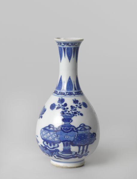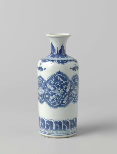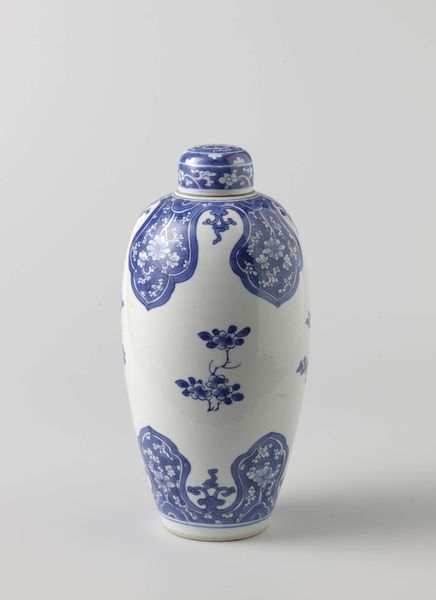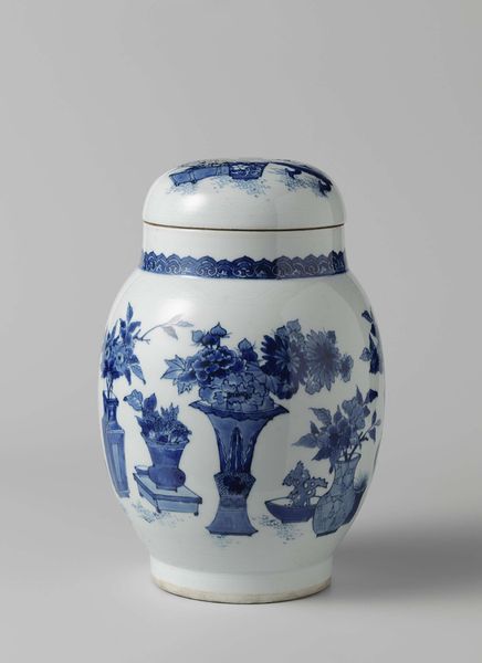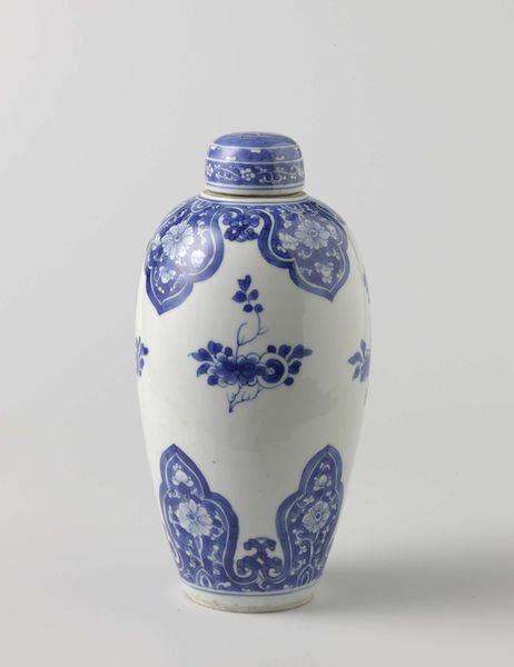 Editor: This delicate ceramic piece, titled "Ovoid covered jar with floral scrolls in reserve in ruyi-shaped panels," dates from around 1680 to 1720. I’m struck by how the cobalt blue designs pop against the white ground. It's beautiful, but in such pristine condition. What kind of a place did this jar hold, do you think? Curator: That's an insightful question! Consider the cultural context: Chinese ceramics, particularly porcelain, were highly prized export goods during that period. Their pristine state makes it seem likely this specific jar might have been destined for the European market, possibly displayed more for its exotic beauty than functional use. Think of the cabinet of curiosities—an indicator of status and global reach. Does that perspective shift your perception of it at all? Editor: Definitely. Knowing it might have been a display piece, elevates its significance. It connects it to the rise of global trade and Western fascination with the "Orient." It speaks of power, doesn't it? Curator: Exactly! It illustrates the politics of imagery and objecthood. The 'exotic' allure was strategically marketed. Now, notice the floral motifs. While aesthetically pleasing, these motifs held symbolic weight within Chinese culture. Perhaps, even those symbolic elements, were a layer of encoding for Chinese patrons but completely misinterpreted, overlooked, or reimagined in the west. What do you make of that duality? Editor: That’s incredible, the symbolism working on different levels depending on who views it. So, the object has a multi-layered history and can represent very different cultural positions at once. Curator: Precisely. And these layers are not only about its origins or destination, but the shifting perspectives throughout the centuries of collectors, owners, and viewers influencing it’s journey from a beautiful jar to cultural artefact. Editor: I see this ceramic in a completely different light now. Thanks!