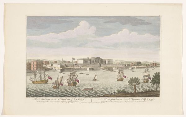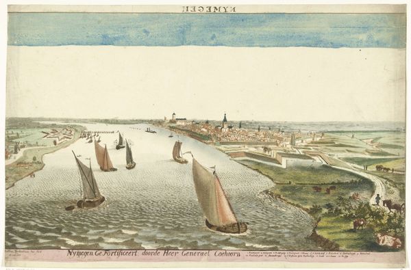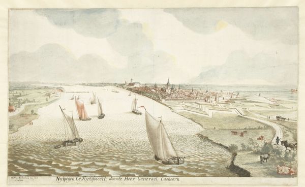 Curator: What a remarkable piece! This watercolor and coloured pencil work, titled "Gezicht op de vestingwerken bij Nijmegen aan de Waal," offers a glimpse into the fortifications near Nijmegen. It’s attributed to Martinus Berkenboom and dates back to between 1700 and 1715. Editor: It has a serene quality. The cool tones of the water and sky are calming, almost belying the military subject matter implied by the fortifications. I’m struck by the precise lines and how they define the architectural forms against the soft watercolor washes. Curator: Absolutely. Berkenboom’s mastery over watercolor as a medium is striking. The ways he's rendered those fortifications – the interplay of the ramparts and earthworks – it tells a story of the labour, the sheer physical effort of building and maintaining such extensive defensive structures. These weren’t simply strategic designs; they represented massive investments of human capital. Editor: Agreed. And the perspectival rendering directs the eye deep into the composition; note the tonal gradations as one reads from the foreground boats to the distant cityscape. Curator: It's fascinating to think about the socio-economic impact. Who were the labourers who built these fortresses? What was the impact on the regional economy? I see this less as a landscape and more as a record of early modern statecraft and social organization, a visual record that offers insights into power dynamics through production. Editor: I appreciate your insights, however, one can’t ignore how that play of light defines forms—the texture of the water, the shapes of the clouds, the architectural structure of the city… Berkenboom creates depth, guiding your eye across the visual field. The subtle use of color is really something special here. Curator: A truly great contribution to early cityscape art with much to say. Thank you for taking the time to examine and discuss. Editor: Indeed! I concur. It was a pleasure.
