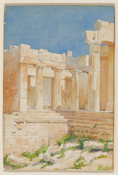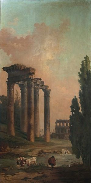 Editor: So, here we have Denman Waldo Ross’s "Landscape with Classical Ruin." It’s quite small, painted on panel, and evokes a sense of serene antiquity. What do you make of this scene? Curator: I'm struck by how Ross blends history and the everyday. Those classical ruins aren't just a backdrop; they’re becoming part of the landscape, like an old song you hear in the wind. The sheep grazing, the shepherds...do they belong to the past or the present? Editor: I hadn’t thought about that blending! It’s like he’s collapsing time. Curator: Exactly! And it reminds us that even ruins were once vibrant, filled with life. Art isn't about recreating the past, but about finding the echo of that life in our present. Editor: It makes me see the painting in a totally new way. Thanks! Curator: My pleasure. Art's a conversation, and all opinions are welcome.