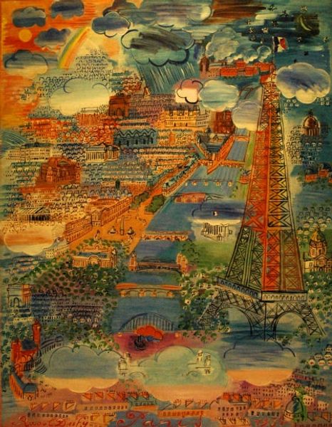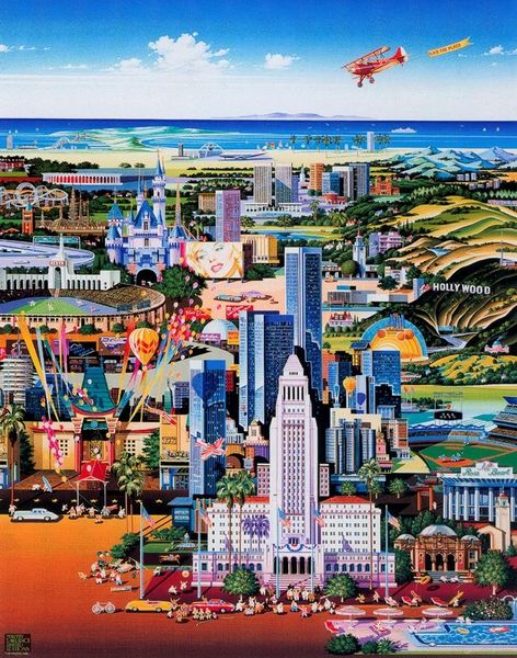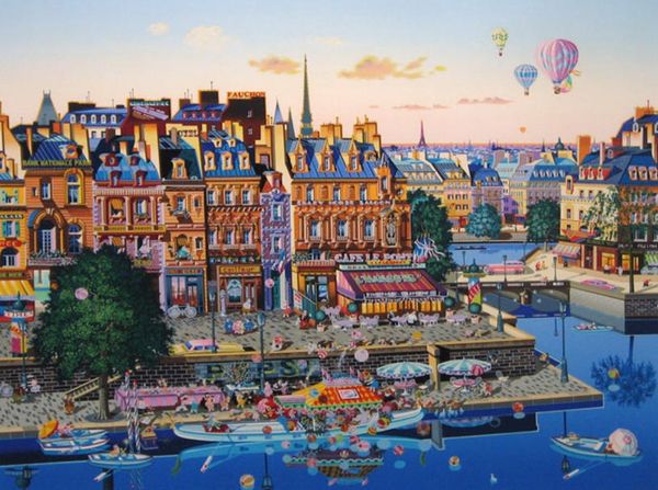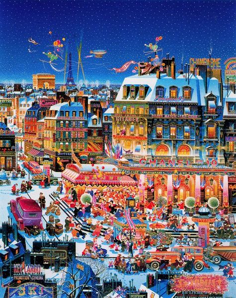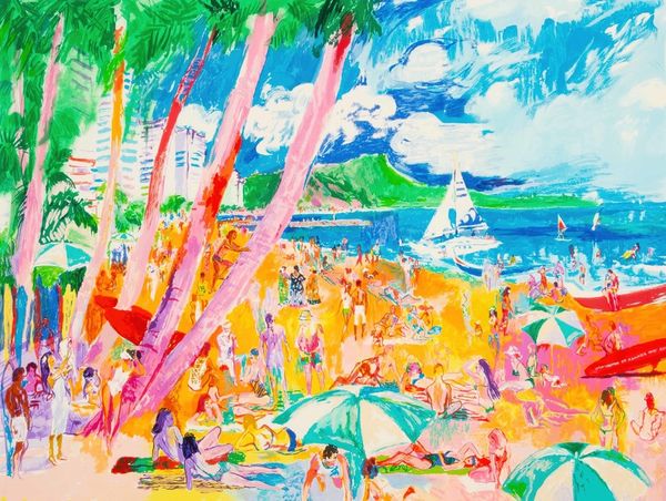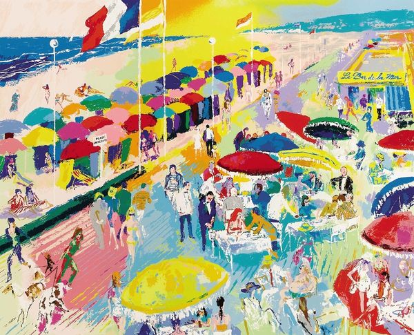 Editor: This is "Perrier," a painting created by Hiro Yamagata in 1986 using acrylic paint. It feels like such a whimsical snapshot of city life, almost like a scene from a storybook. All these vibrant colours, especially the sky-blue palette... What is your reading of this piece? Curator: Indeed. First, consider the flatness, the two-dimensionality rigorously maintained by the artist. Space is constructed not through illusionistic depth, but through overlapping planes of colour and form. Notice the simplification of architectural details: buildings are rendered as blocks of colour, prioritising geometrical forms over realistic depiction. What effect does this stylisation achieve? Editor: It makes the scene feel a little abstracted and dreamlike. It distances the image from mere representation. Curator: Precisely. The high-key palette, dominated by blues, whites, and reds, contributes to this effect. We might observe how Yamagata employs line—thin, controlled—to delineate shapes and define edges. What about the relationship between the human figures and their environment? Editor: Well, there are lots of people, but none of them really stand out as the subject of the work, so that our eyes are drawn back to the structural elements – the buildings and even the blimp overhead. Curator: Yes, the human figures are integrated into the cityscape as elements of visual interest, rather than serving as the focal point. This integration emphasises the artwork's formalism. It prioritises surface design and the interplay of colour and shape. The depiction invites scrutiny. Now, how does the interplay of shapes animate the cityscape, then? Editor: Seeing that shapes bring everything into view with the overlapping. The structural integrity holds even the sky elements as still within the parameters. This wasn't what I was looking for upon initial observation, so this was illuminating! Curator: It invites new understandings and visual experience. Yes.