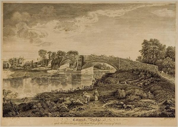 Editor: So, this is Jean-Baptiste-Claude Chatelain's "Landscape with the Nobleman of Capernaum". It's interesting how the landscape seems to dwarf the figures. What do you see in this piece? Curator: I see an aquatint deeply rooted in the production and circulation of images. The printmaking process itself, using acid to etch the image onto the plate, suggests a specific kind of labor and accessibility. Editor: Accessibility? Curator: Yes. Prints like this allowed for wider distribution and consumption of landscape imagery, turning even biblical scenes into commodities. Editor: That's a perspective I hadn’t considered. It makes me think about how art was experienced by different classes in the 18th century. Thanks! Curator: Indeed, thinking about the "means of production" changes our view of even seemingly idyllic scenes.