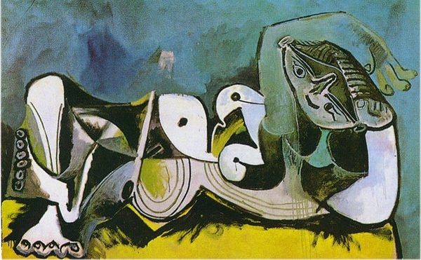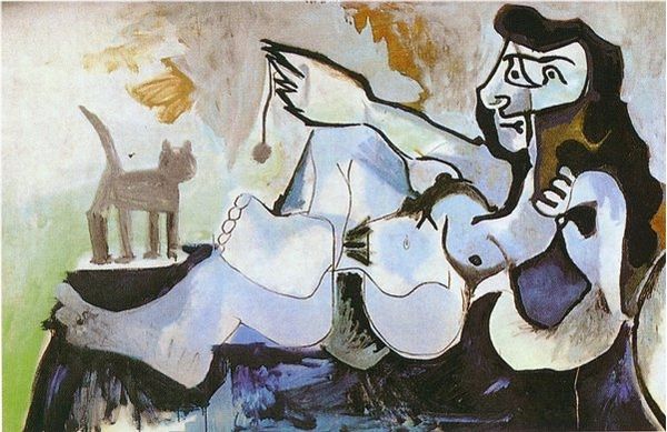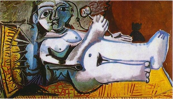 Editor: We’re looking at Picasso’s “Lying female nude playing with cat,” an oil painting from 1964. It’s… well, fragmented, isn’t it? Almost like a puzzle, but unsettling. What do you see in this piece? Curator: Beyond the Cubist style, I see a powerful connection to the Venus archetype – the reclining nude – reworked through a deeply personal lens. Note the cat – a long-standing symbol of femininity, domesticity, but also a kind of untamed power. Picasso paints them together to tell a more complex story. What story do you think he's trying to tell? Editor: That's interesting. So it’s more than just deconstructing the female form; he’s actually exploring feminine identity? The cat definitely adds an edge to it; there's an almost playful aggression there. Curator: Exactly! And consider Picasso’s own life. His muses, his relationships – all turbulent. This image could be seen as a symbol of those dynamics: the female figure, powerful but confined within the frame, perhaps representative of his relationship to his own creative subjects. Notice how even the distortion emphasizes certain power centers in the body: the eyes, the breasts, the hand playing with the cat. Editor: I never thought about it that way before, reading it almost as a portrait of a relationship, with all the tensions and power dynamics visualized through those symbolic choices and distortions. Curator: And that’s the beauty of iconography – layers upon layers of meaning embedded in even the most abstract forms. It makes you think about the role of cultural memory within images. Editor: It definitely does. I’ll never look at another Picasso the same way! Curator: Nor I!