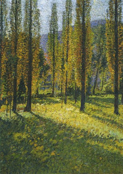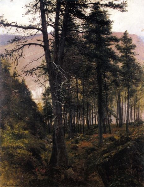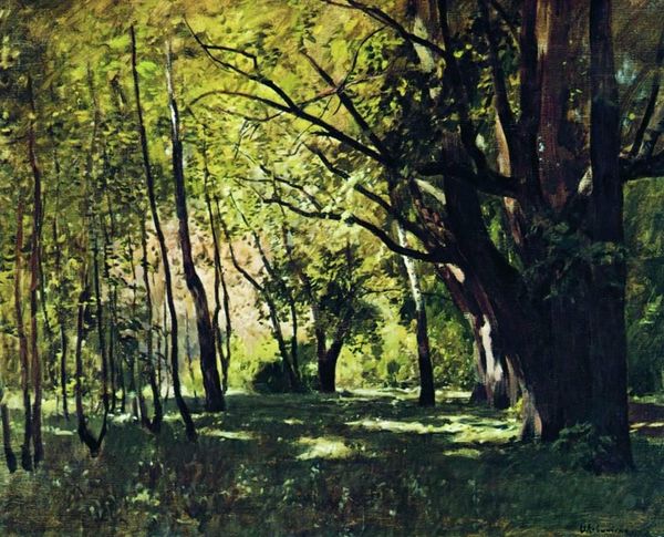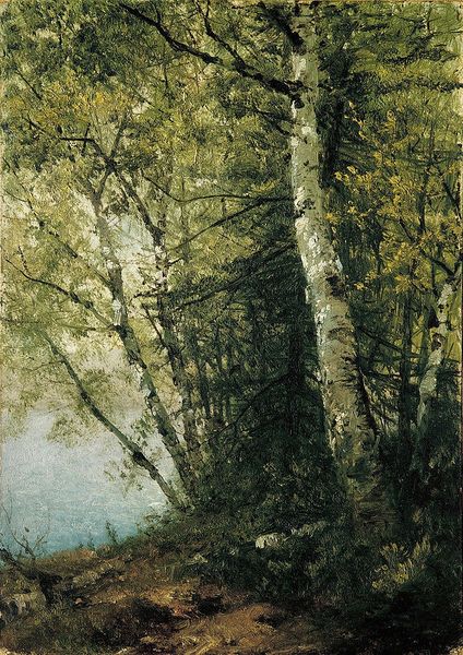 Curator: Before us we have "Winter, England", an oil-on-canvas artwork crafted in 1920 by Tom Roberts, painted en plein-air, focusing on the landscape around him. What’s your initial response to this seemingly simple woodland scene? Editor: Honestly? Melancholy. There's something incredibly still about it, even desolate. Like a moment caught between breaths. And the contrast of that almost sickly yellow ground against the greys and blues... unsettling, yet compelling. Curator: I find it interesting you fixate on color. Roberts was known for his meticulous approach to depicting light and atmosphere through materiality. Considering he created this 'en plein air', the act of painting itself becomes significant. Editor: Absolutely! I can almost feel the cold seeping off the canvas, feel the rawness. It’s not just a picture of winter; it's the sensation of winter. You can almost smell the damp wood and frozen earth and see the traces of light hitting the highest points of each tree. Curator: Roberts lived most of his life in Australia, but he came back to live out the remainder of his life in England. These are British trees, painted in situ, which emphasizes the inherent labor of capturing a very specific locale at a certain point. How does it compare with earlier, idealized depictions of the British landscape? Editor: It's so grounded, literally! It pulls you out of Romantic fantasies. It acknowledges decay and stillness; the wood is clearly dead, so this artwork depicts nature in all its cycles of birth, death, and transformation. Curator: Indeed. It challenges expectations of the pastoral landscape, replacing idyllic tropes with the unvarnished realities of the English countryside. The material of oil paint then, allows Roberts to represent something raw and essential in his art. Editor: It feels incredibly personal, like Roberts isn't just painting what he sees, but how he feels about being there, witnessing it. The loneliness. Curator: Perhaps, or maybe it's his commitment to an art practice, working 'en plein air' late in life in a new environment, to document its character with such specificity. Thanks for helping unpack it, it makes you look at Roberts’s artwork in a new way! Editor: And thank you for pulling me back from my reverie. It is much more fascinating than it looks at first glance.